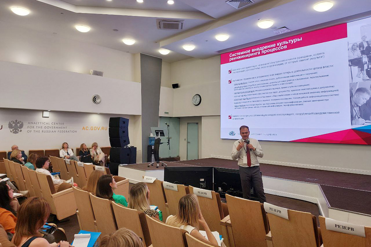 Северную столицу представил Игорь Мурашев, заместитель председателя Комитета государственной службы и кадровой политики Администрации Губернатора Санкт‑Петербурга. Он рассказал, каким образом использование бережливых технологий помогает снижать трудоемкость рабочих процессов и улучшать опыт как внешних, так и внутренних клиентов.