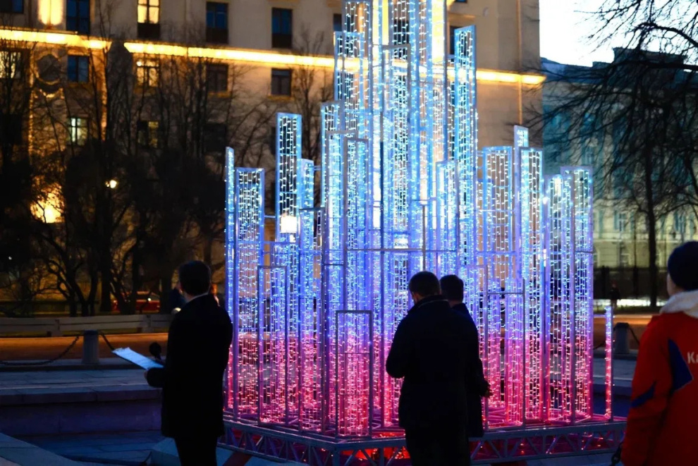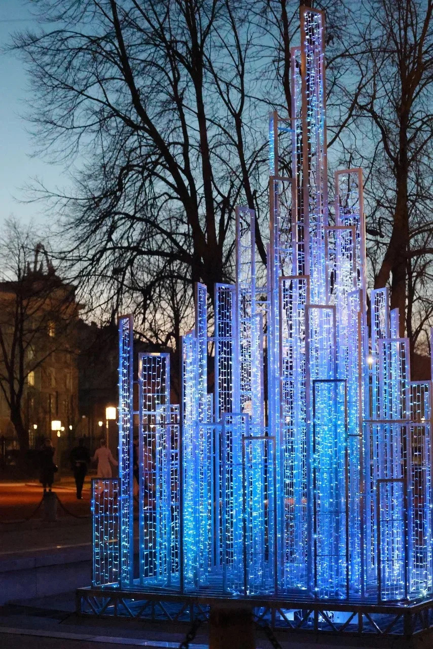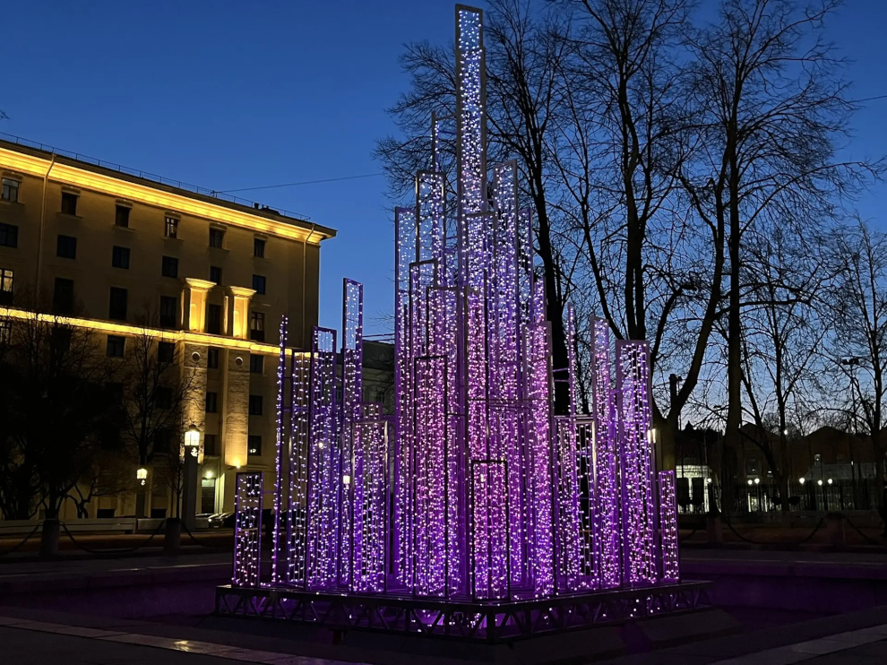 Проект «Зимние фонтаны», запущенный в декабре 2025 года, открыл новую страницу в жизни петербургских фонтанов: впервые чаши в Казанском и Нахимовском скверах стали высокотехнологичными световыми арт‑объектами. В отличие от летних водных фонтанов, зимние инсталляции выполнены из алюминиевого каркаса и светодиодных гирлянд. Высота конструкций – до 7 метров, мощность – до 5 кВт. Они устойчивы к влаге и ветровым нагрузкам, а программируемые сценарии позволяют менять цвет, интенсивность и динамику свечения.