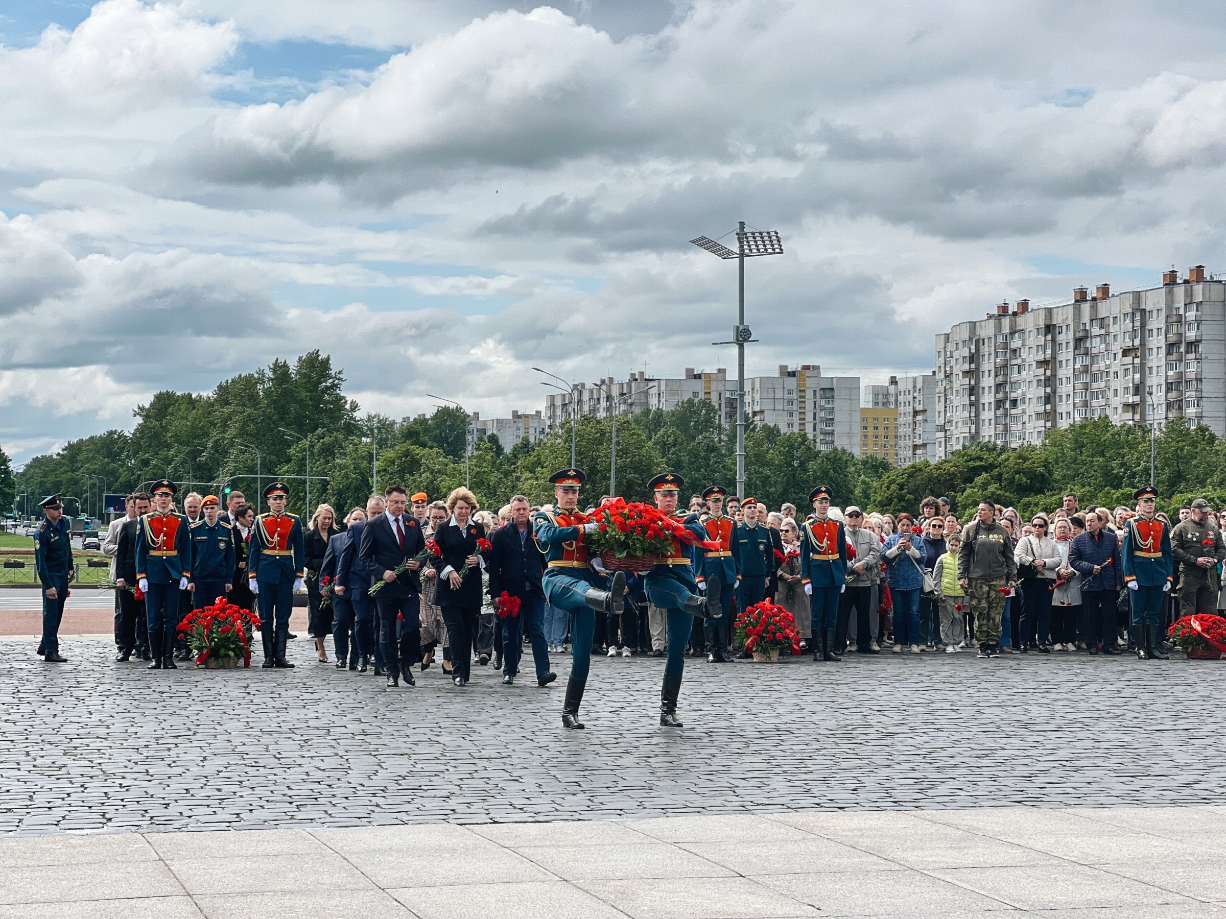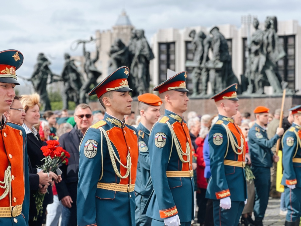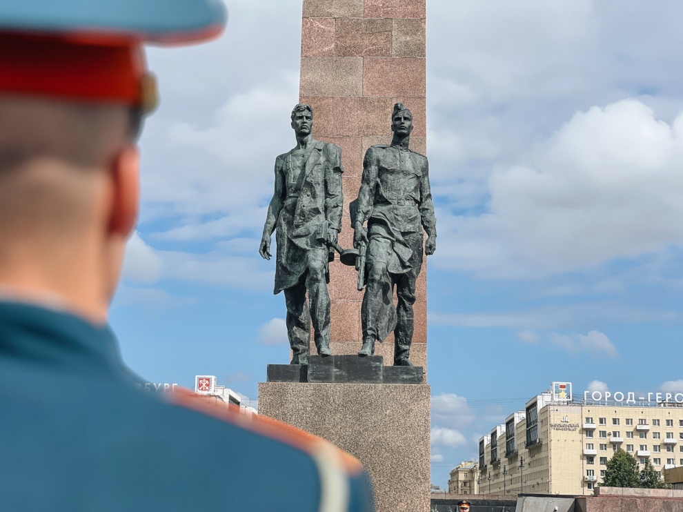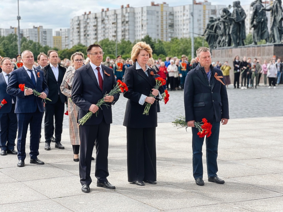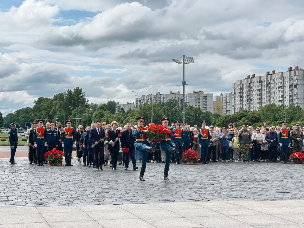 В память о погибших в годы Великой Отечественной войны цветы к Монументу героическим защитникам Ленинграда возложили вице-губернаторы Санкт‑Петербурга Владимир Омельницкий, Ирина Потехина и Кирилл Поляков, депутаты Законодательного собрания, представители общественных организаций, ветераны, студенты, школьники и жители города. Участники церемонии почтили память жертв минутой молчания.
