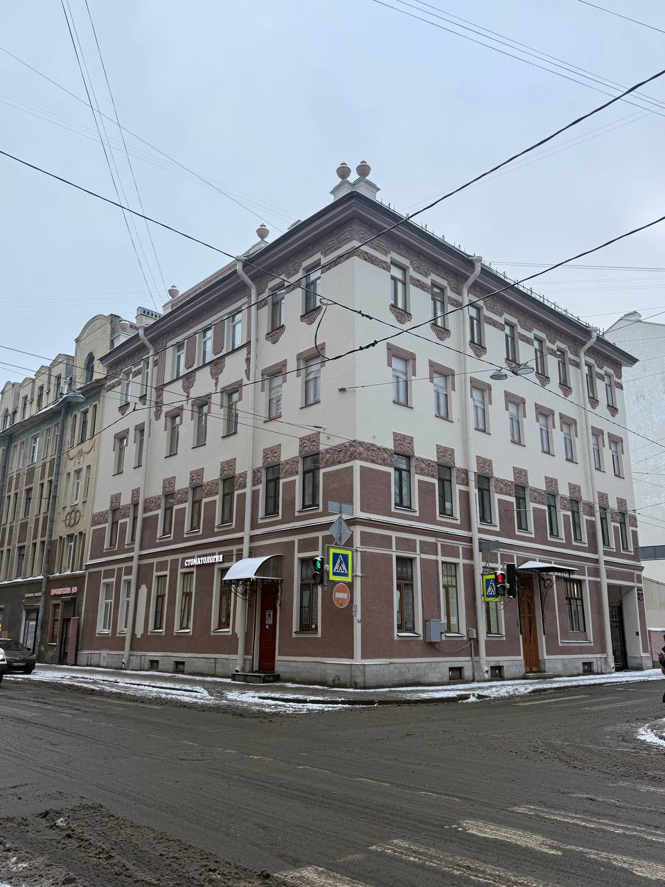 Четырехэтажное угловое здание в стиле модерн по улице Бармалеева было построено в 1905 году, по проекту архитектора и художника Оттона Игнатовича. Владельцем этого дома в 1917 году числился тайный советник Адольф Христианович Гольмстем. Строение примечательно своим сложным декором и оригинальными рельефами. Лицевые фасады выполнены в контрастном цветовом решении, что позволяет дополнительно акцентировать лепнину — это оригинальный прием в духе архитектурного стиля модерн. Для декора был специально подобран цвет Л-3а из традиционной петербургской палитры, который удачно сочетается с основным колером Л-15а.