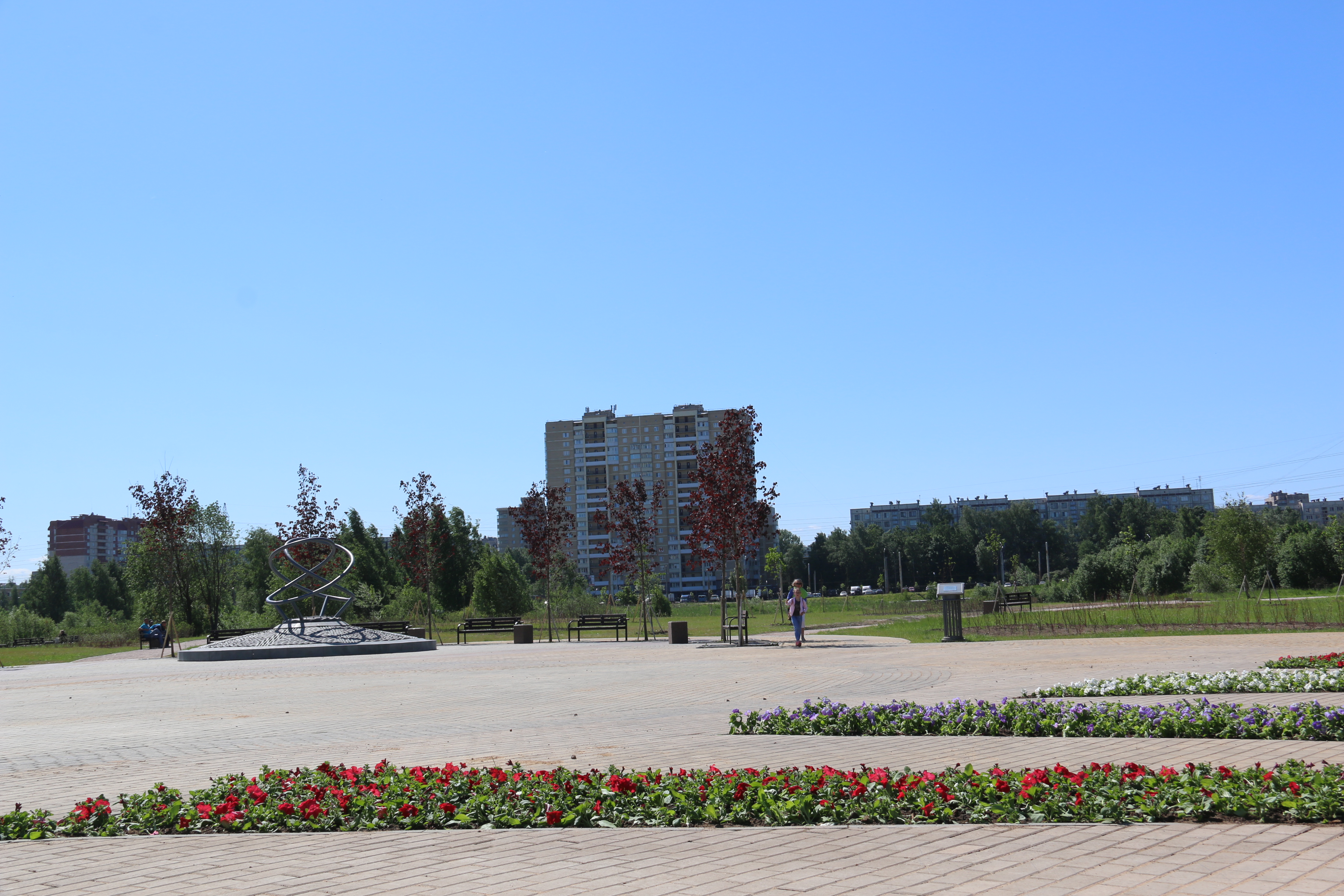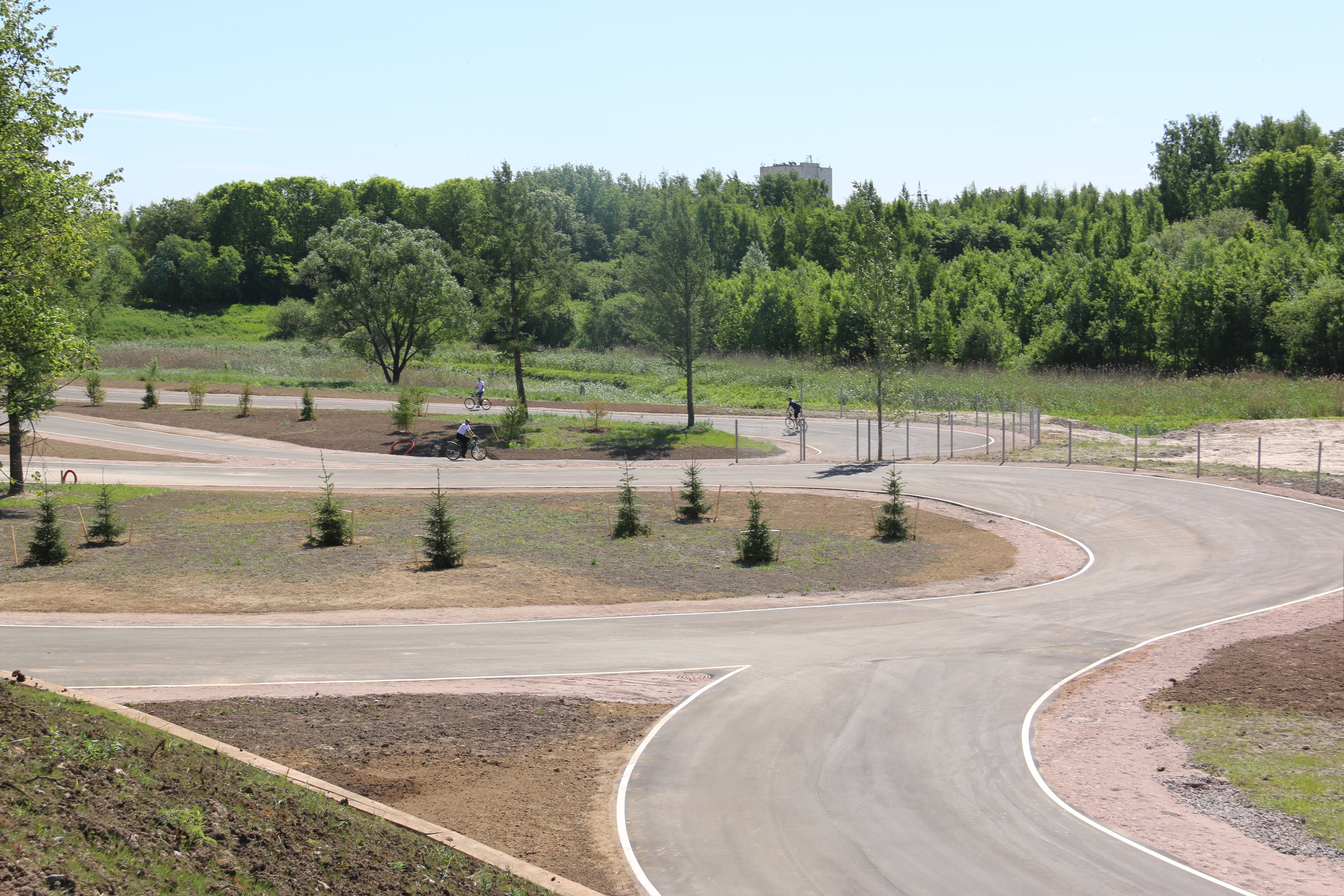 За 9 месяцев подрядчик полностью преобразил территорию площадью 13 га. В парке разбиты свыше 80 тысяч квадратных метров газонов, появились видовые площадки и прогулочные дорожки, обустроены два игровых детских городка. На территориях для тихого отдыха установлены скамейки, их окружают посадки сирени, спиреи, кизильника, розы, деревья и цветники.