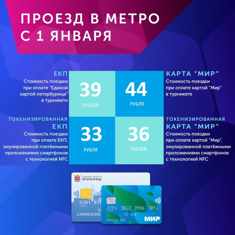 С 1 января по 31 декабря 2021 одна поездка в метро обойдется в 44 рубля при оплате бесконтактной банковской картой платежной системы «Мир», Единой картой петербуржца – 39 рублей. Скидка к разовому тарифу составит 16 рублей и 21 рубль соответственно.