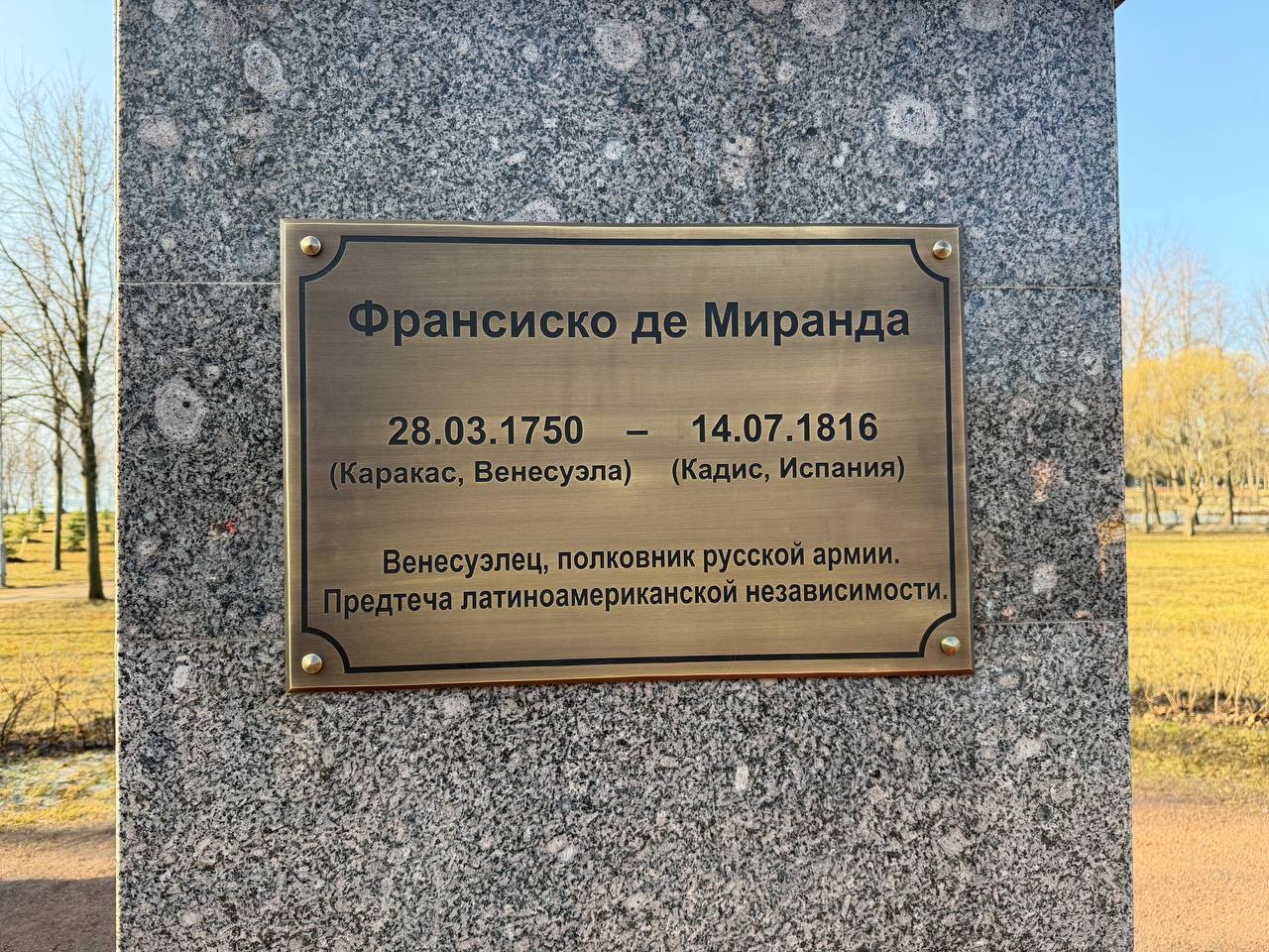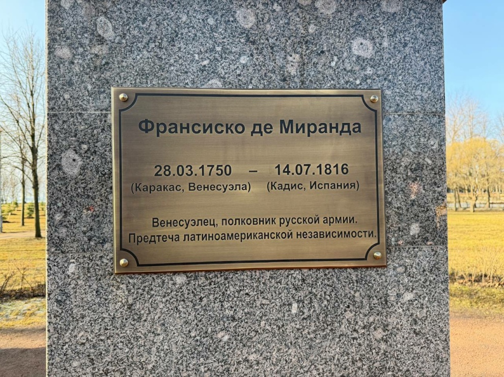 28 марта в день рождения Франсиско де Миранды в Парке 300-летия Санкт‑Петербурга состоялась торжественная церемония открытия новой мемориальной таблички на памятнике венесуэльскому национальному герою.