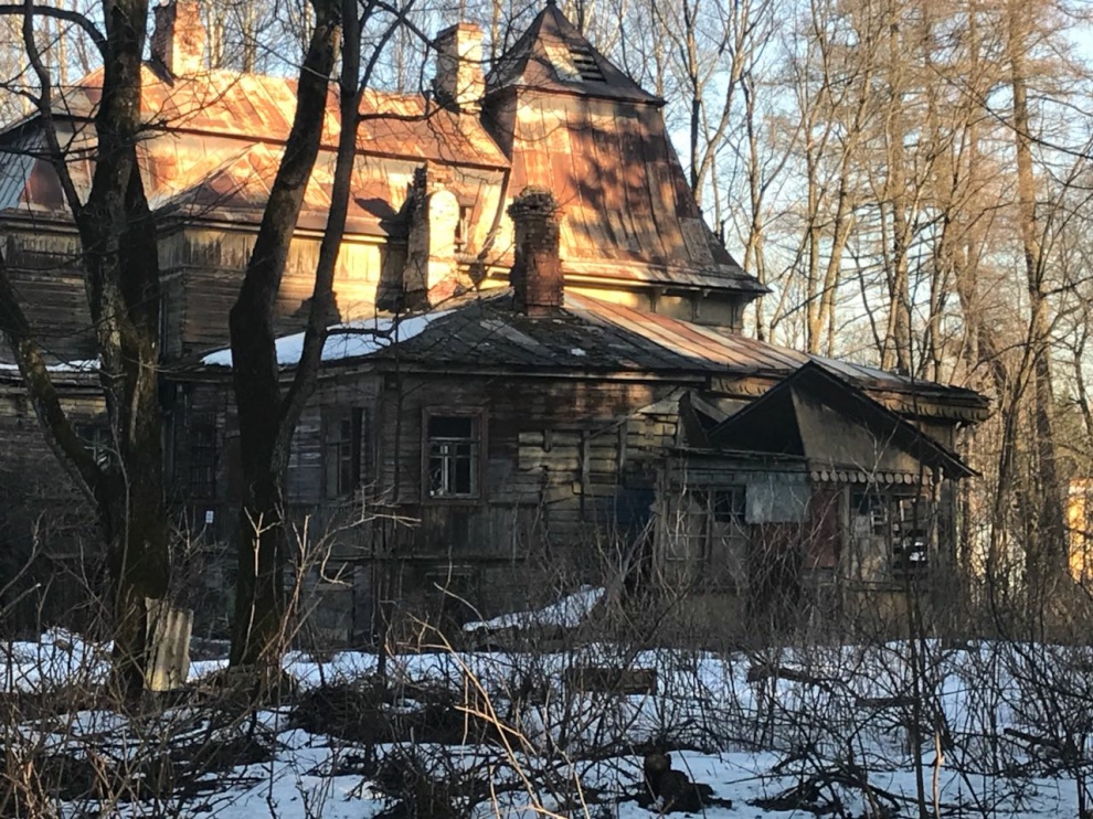 Одно-двухэтажный бревенчатый дом, с высокой шатровой кровлей центрального двухэтажного объема, является примером загородной постройки, в оформлении которой использованы мотивы готики.