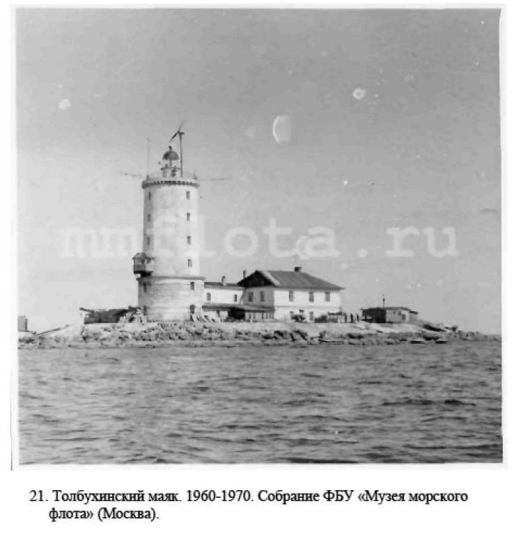 Начало строительство маяка на косе Котлинской (ныне – Толбухина) относится к 1718 году. «На записке, писанной Петром 13 ноября, о разных сооружениях, которые он предполагал произвести на Котлине, между прочими пунктами написано: «Сделать Колм каменный с фонарем на косе Котлинской» и против этого пункта сделана пометка: «чертеж отдан в.а.» (то есть вице-адмиралу Крюйсу)». [Головизнин К. Русские маяки в царствование Петра Великого/ «Морской сборник» №10, 1884. С. 38]