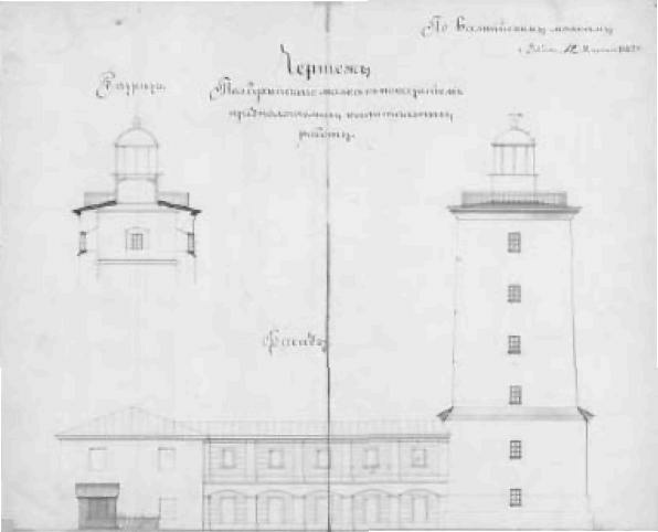К осени 1810 года под наблюдением капитана 2-го ранга Л.В. Спафарьева возведена круглая башня из кирпича на гранитном цоколе, караульный дом и баня. В верхней части маяка был смонтирован металлический двенадцатигранный фонарь с масляными лампами н отражателями, обеспечивавший 24-метровую высоту огня. Маяк обслуживали офицер-смотритель, унтер-офицер и семь матросов.