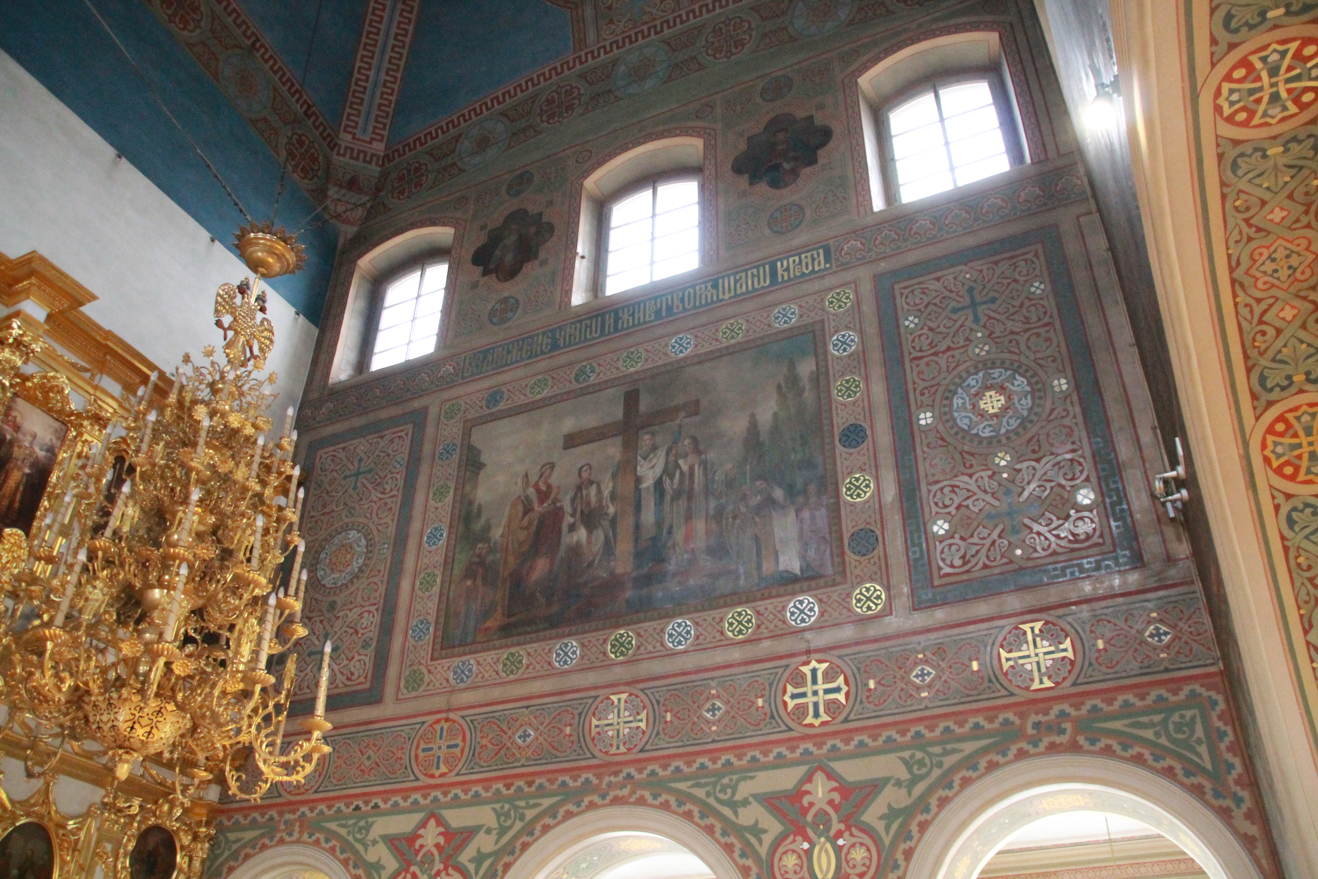 Три стены верхнего храма украшены большими фрагментами монументальной живописи, выполненной в технике «масло по штукатурке», посвященной престольному празднику главного алтаря верхнего храма – Воздвижению Честного и Животворящего Креста Господня. Это редкие иконографические сюжеты. На южной стене – «Обретение Креста Господня в 326 году Святой Равноапостольной царицей Еленой». На северной стене – «Возвращение Животворящего Креста Господня из персидского плена». На западной стене – фрагмент «Несения Креста». Большая часть изображения на западной стене утрачена в связи с пробивкой дверного проема, сохранились лишь фигуры воинов, а над ними – изображения двух ангелов.