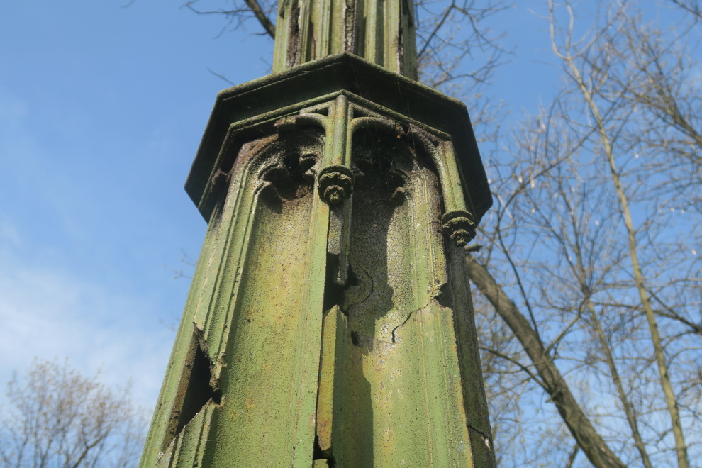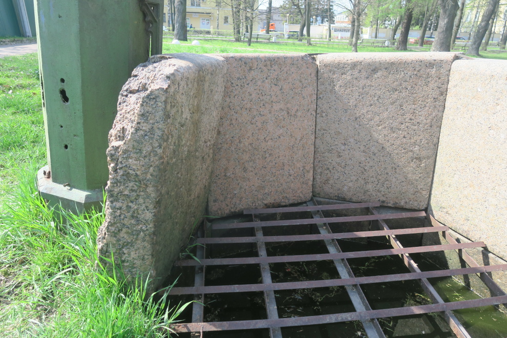 Чугунная колонка деформирована и наклонена, два верхних яруса полностью утрачены. Отсутствует завершение шпиля чугунного столба. Три из восьми плит гранитного барьера упали (две утрачены, одна лежит рядом).