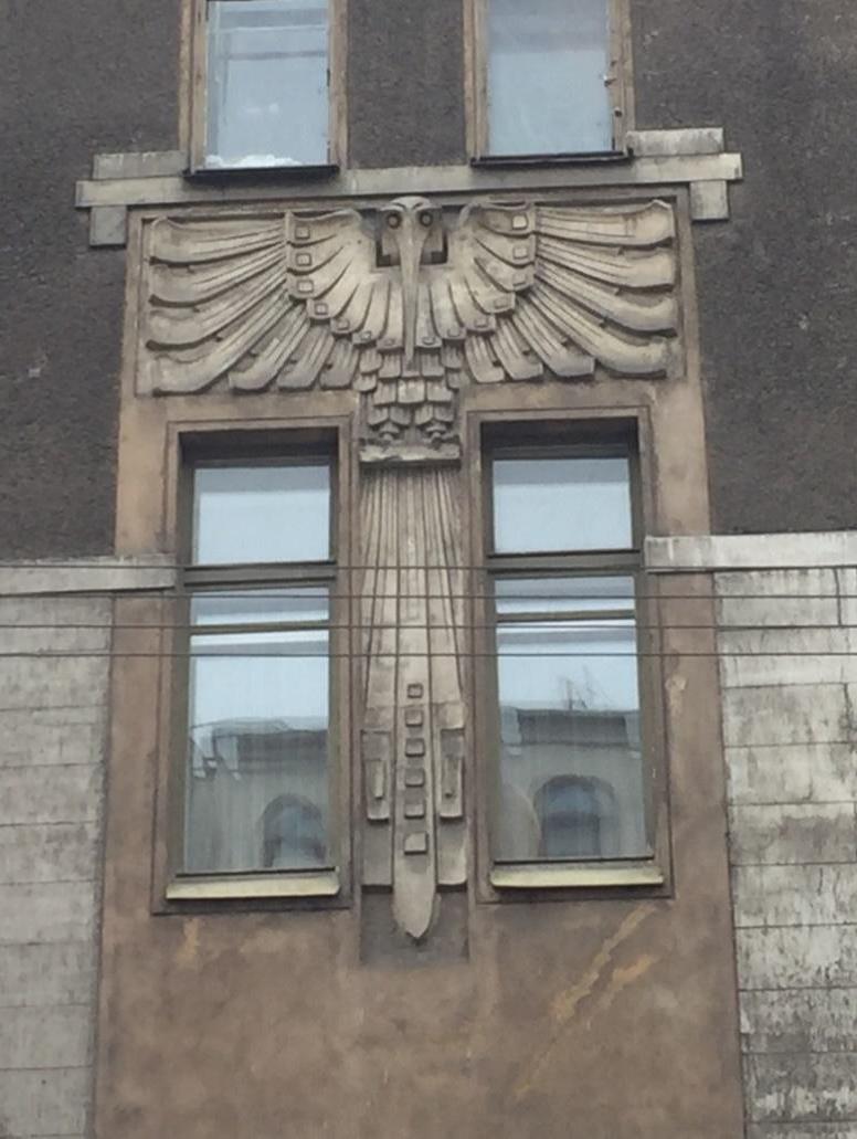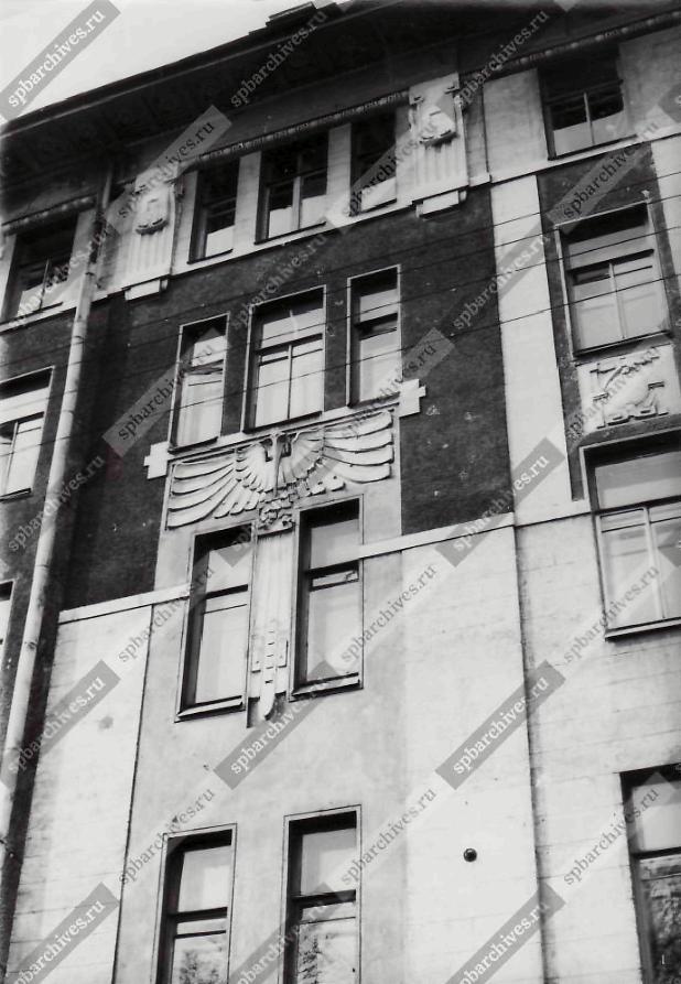 Доминирующими элементами в декоративном оформлении фасадов являются масштабные барельефные изображения стилизованных птиц, поддерживающих крыльями подоконники в уровне четвертого этажа. Подоконные пространства в уровне четвертого этажа декорированы лепными композициями. Межоконные пространства в уровне пятого этажа оформлены стилизованными пилястрами. В угловой части здания в уровне между вторым и третьим этажами установлена плакетка с советской символикой.