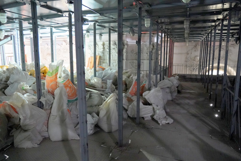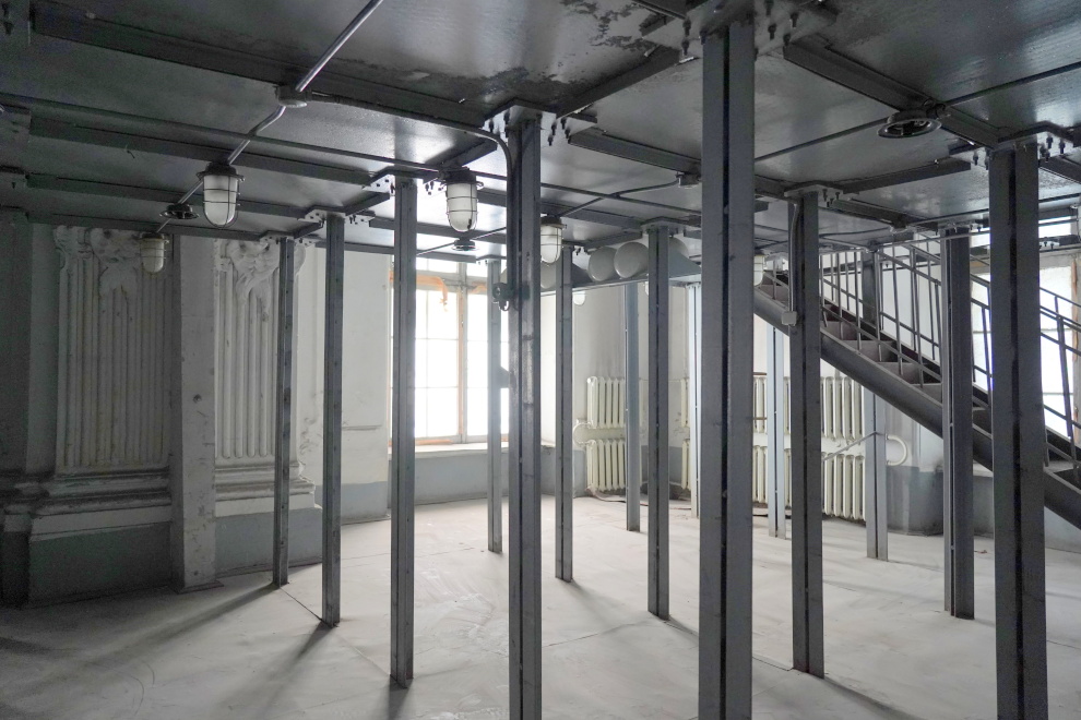 В настоящее время деревянные строительные леса для реставрации штукатурно-лепного декора стен барабана установлены с опорой на верхнюю площадку металлического архивного стеллажа.