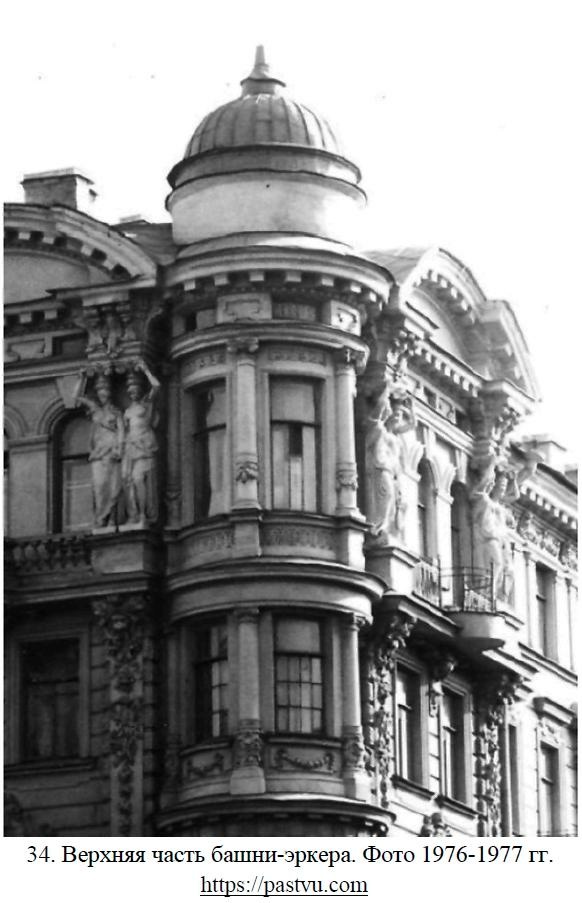 На фасадах в уровне 3-4-го этажей располагаются три эркера, завершающиеся балконами. Эркеры оформлены пилястрами с муфтами в нижней части и ионическими капителями.