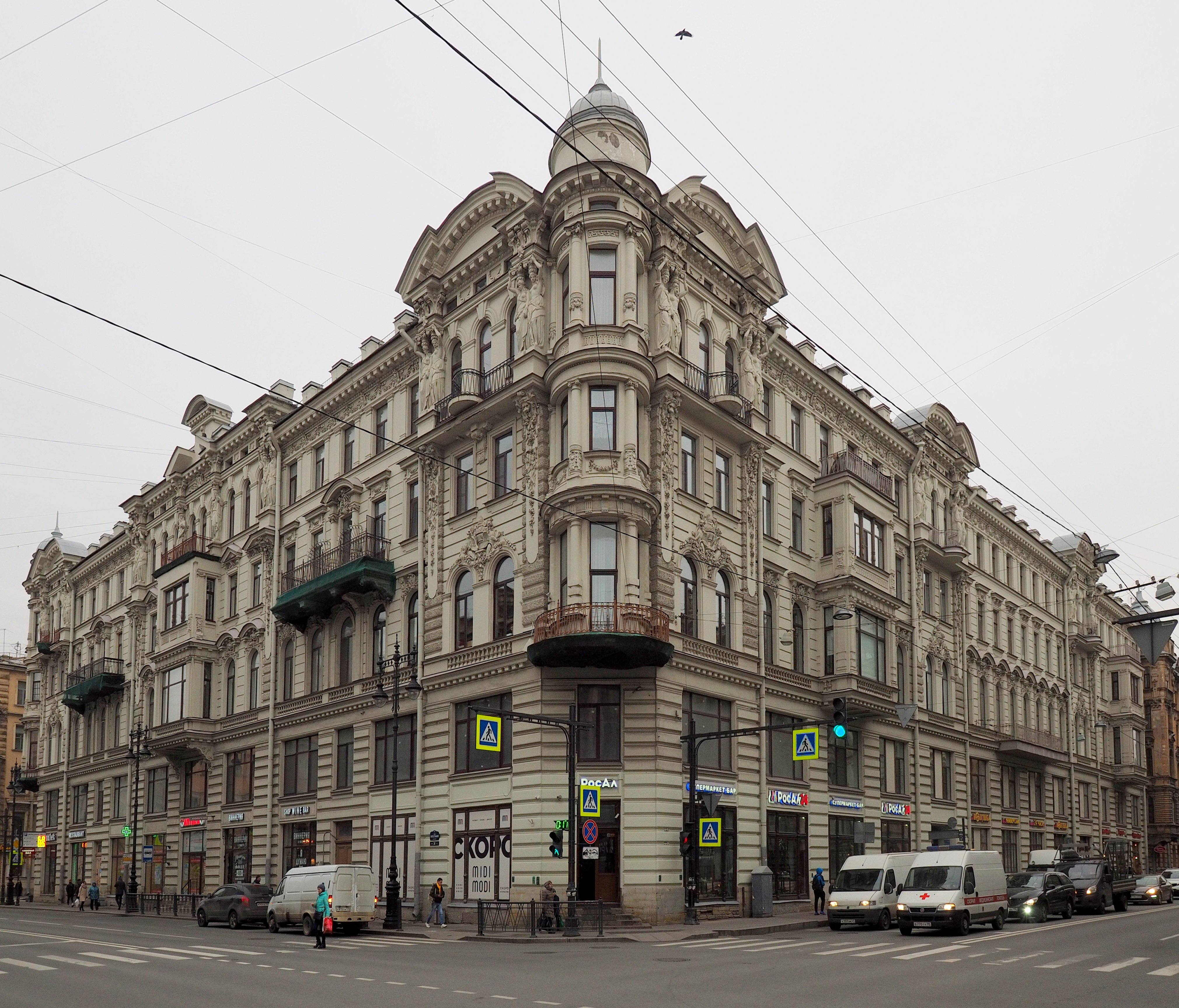 Лицевые фасады выполнены в приёмах эклектики, декорированы кариатидами, гирляндами из цветов и фруктов, львиными головами, маскаронами. Углы здания акцентированы полуциркульными башнями-эркерами, увенчаны небольшими шлемовидными куполами со шпилями. Венчающий профилированный раскрепованный карниз декорирован сухариками и поясом иоников.