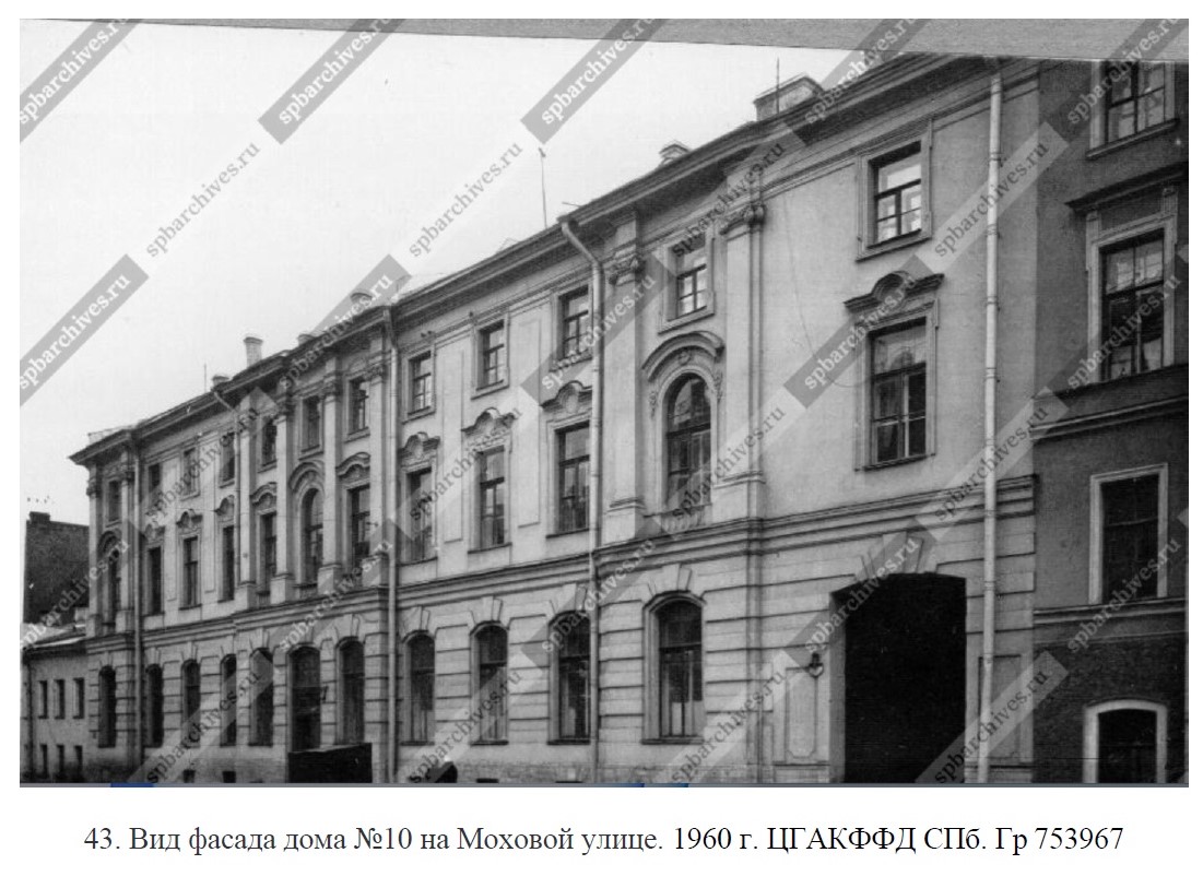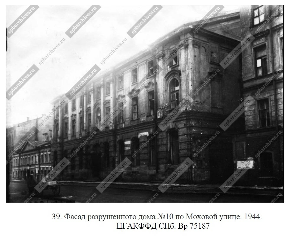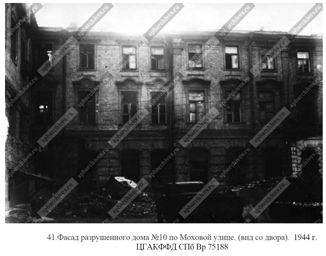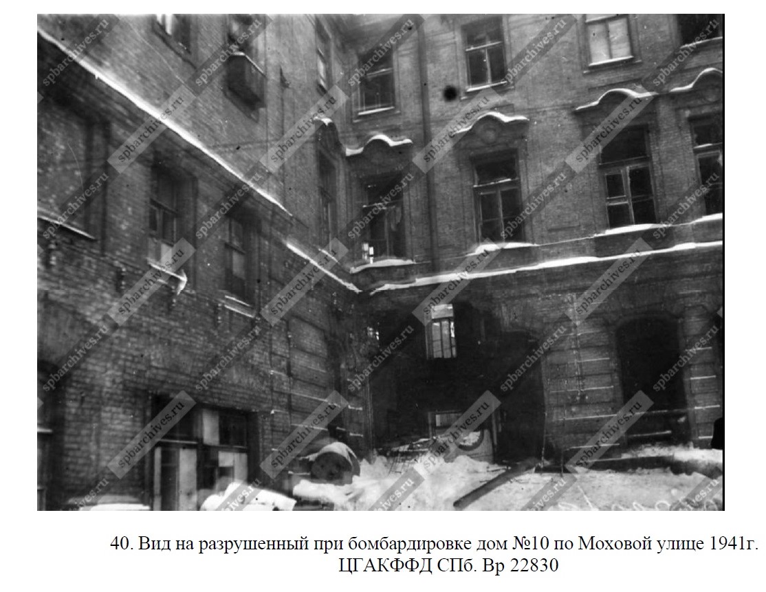 В годы блокады Ленинграда здание пострадало от обстрелов. По данным оперативной сводки № 79 штаба местной противовоздушной обороны города Ленинграда о результатах артиллерийского обстрела и воздушного нападения на город на 14 ноября 1941 года на здание по адресу: Моховая ул., 10 была сброшена фугасная бомба, в результате чего здание было разрушено внутри двора и со стороны фасада. Произошел завал бомбоубежища. Разрушен водопровод.