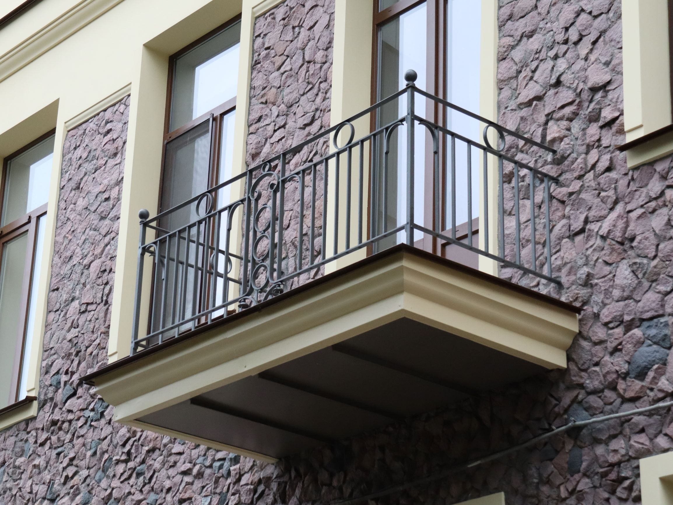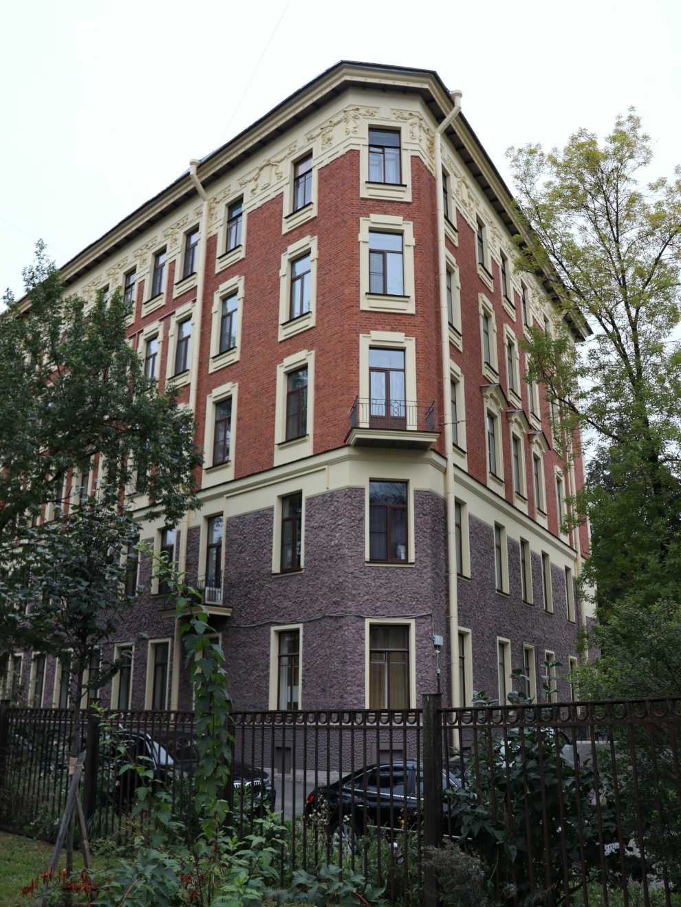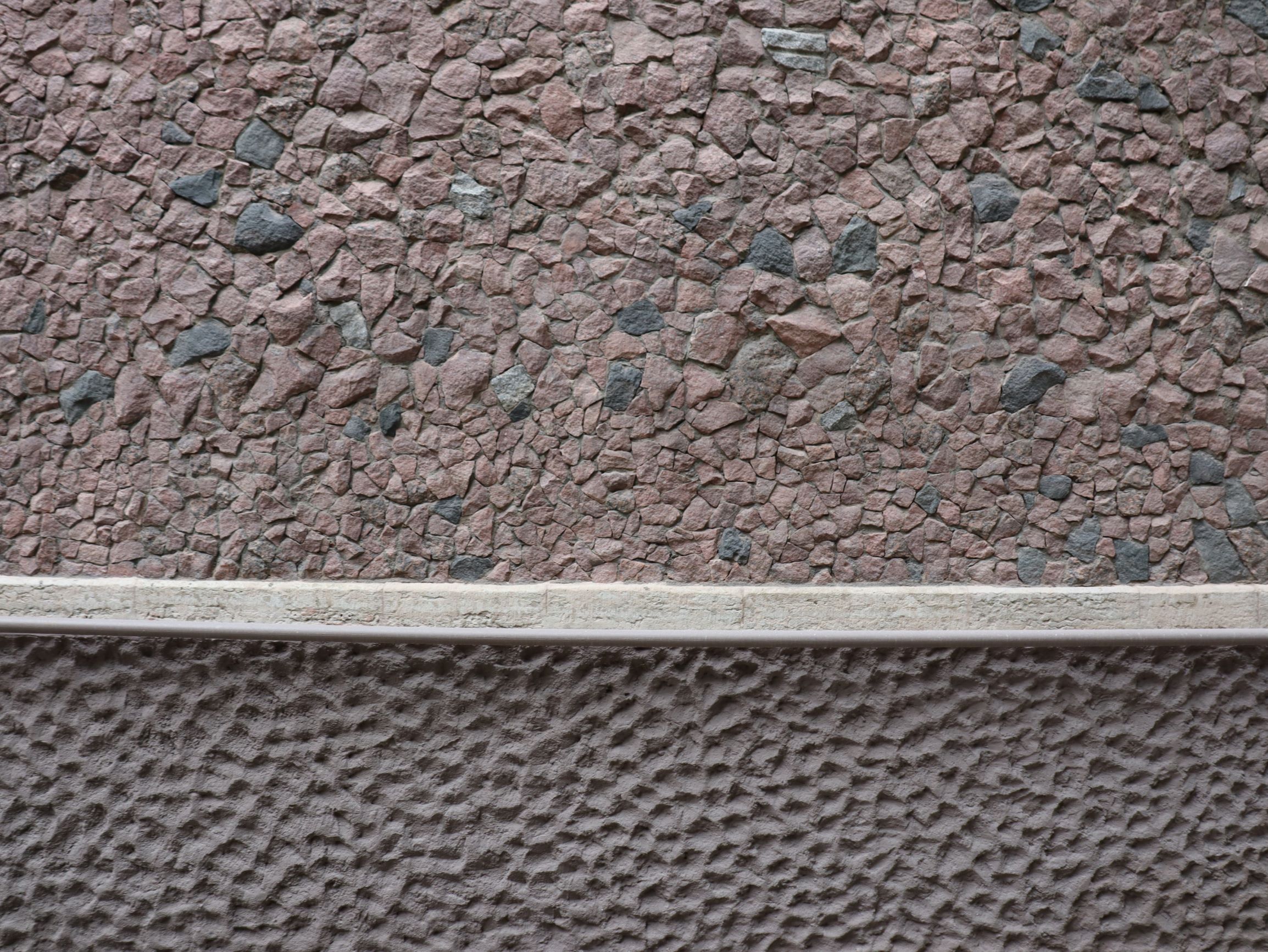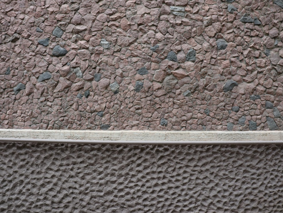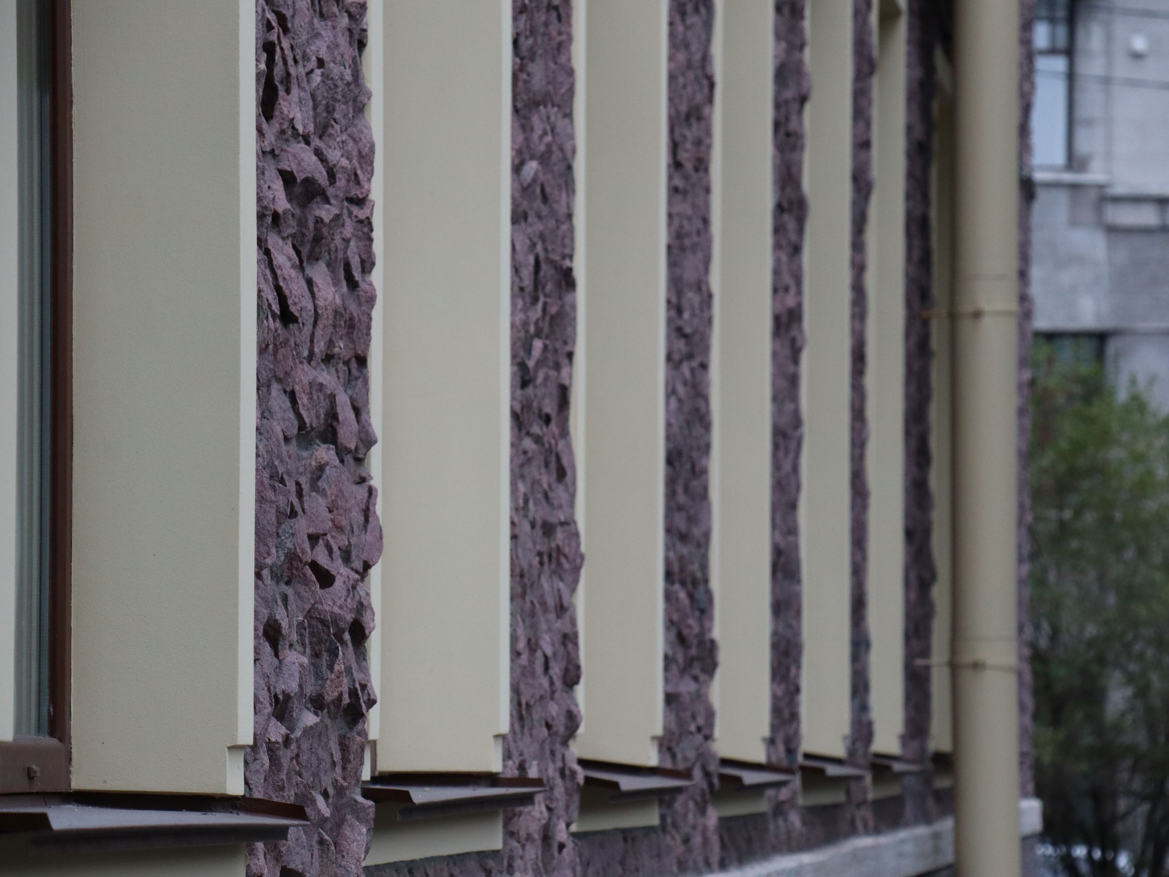 В оформлении фасадов использованы декоративная штукатурка, имитирующая бучардированный камень, и три вида бутового камня с колотой фактурой: гранит красно-коричневого цвета, гранит-рапакиви (питерлит) и габбро-диабаз. Для восполнения утрат облицовки материал заказывали из разных карьеров.