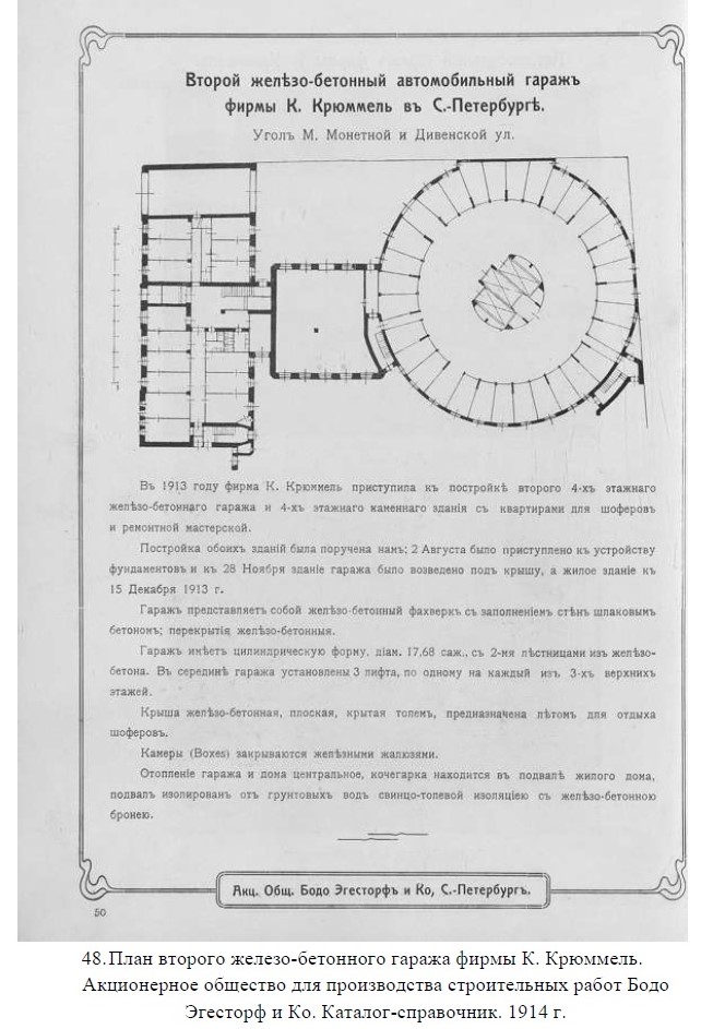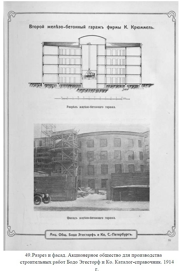 Строительство четырёхэтажного гаража велось с 1913 по 1914 годы. Летом 1913 года в Санкт‑Петербургскую городскую управу подано прошение о постройке четырёхэтажного здания.