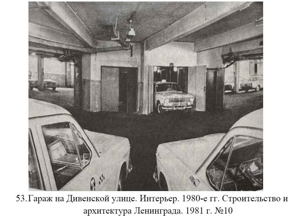 «Помимо функционального значения, шахта играет важную конструктивную роль, являясь монолитным ядром жесткости рамного каркаса. Наличие трёх лифтов обеспечивало оптимальный режим вертикальных коммуникаций, и вместе с тем такое оборудование занимало минимум площади. Односторонняя ориентация подъемников объяснялась отсутствием сквозного проезда, устройству которого препятствовали замкнутые границы владения» (Кириков Б. М., Фёдоров С. Г. Гаражи начала века // Строительство и архитектура Ленинграда. 1981. Nº 10. C. 37–38).