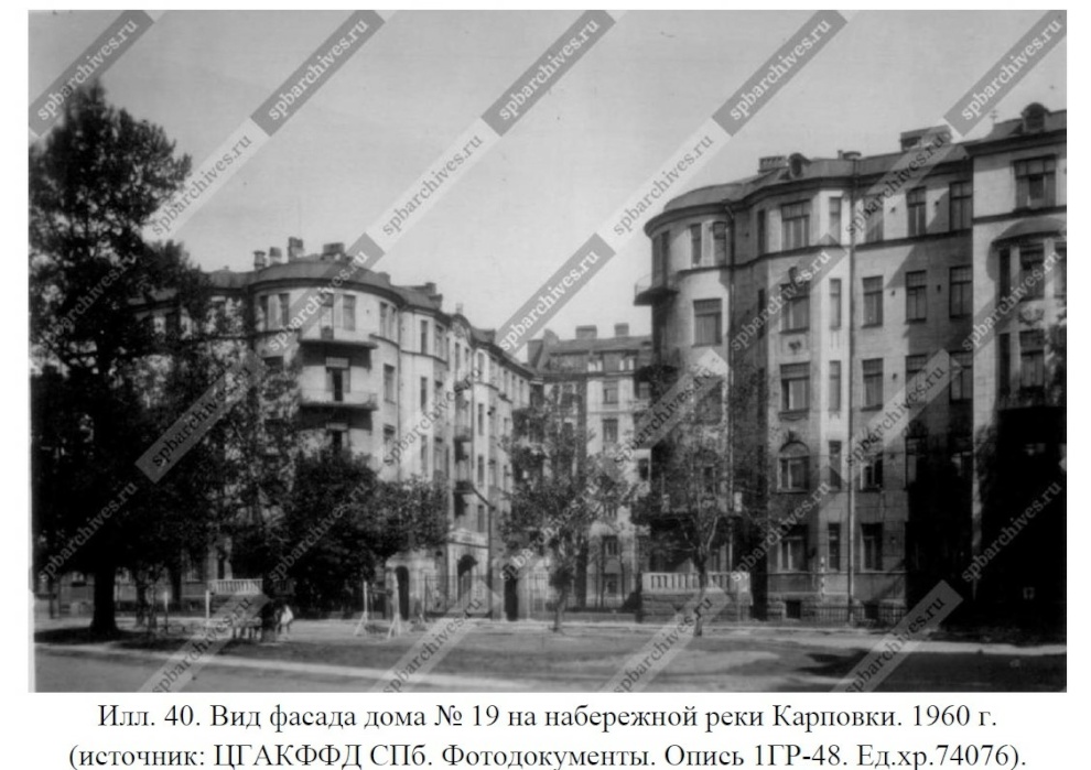 В 1912 году А.А. Смульский продал участок на набережной реки Карповки, 19 Второму Санкт‑Петербургскому товариществу для устройства постоянных квартир, а в апреле того же года по ходатайству А.И. Зазерского в Санкт‑Петербургскую городскую управу поступил проект двух каменных пятиэтажных лицевых домов с мансардами и шестиэтажного флигеля с нежилой мансардой.