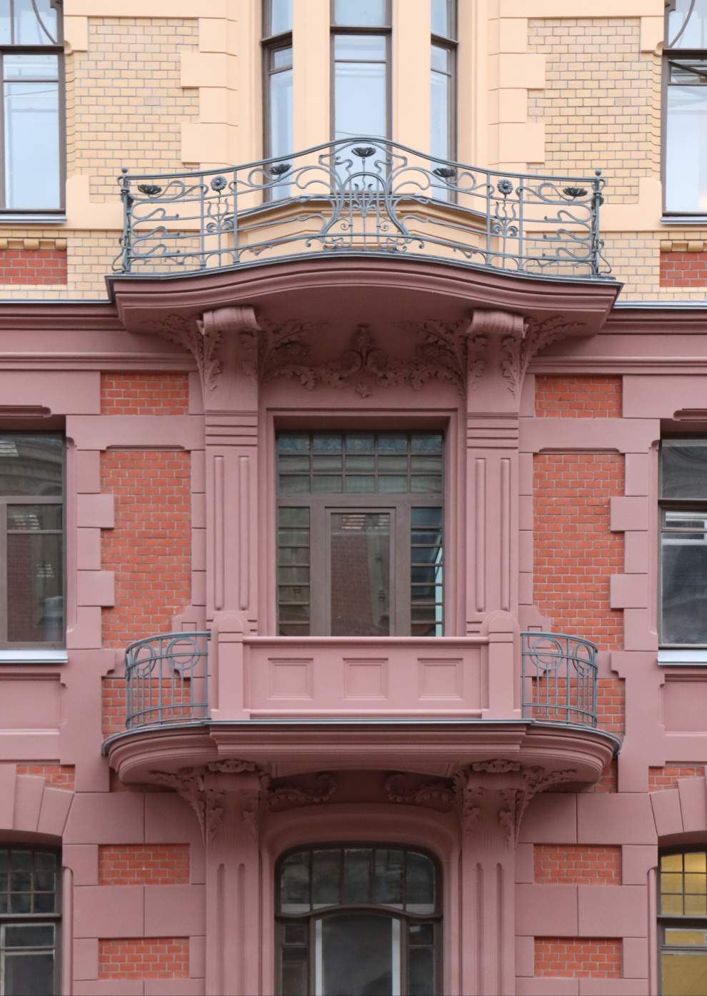 Несущие конструкции балконов отремонтированы с восстановлением и реставрацией каменных и металлических кованых ограждений. Восстановлены чешуйчатые окрытия эркеров.