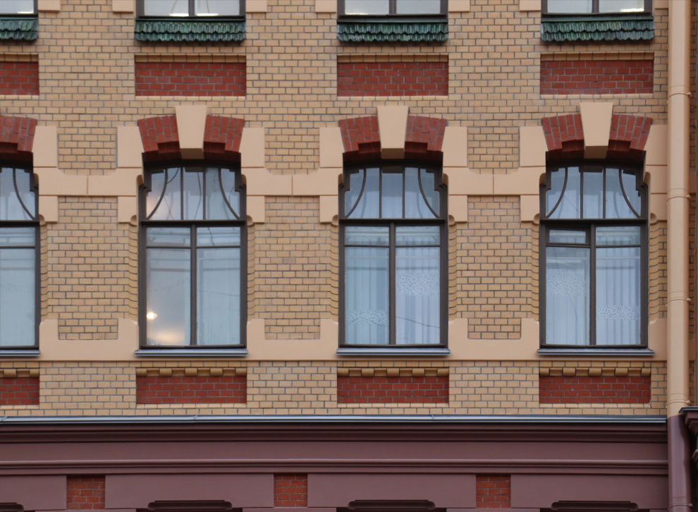 Отреставрирован с восстановлением утраченных фрагментов лепной декор, в том числе листья чертополоха под балконами, наружные столярные заполнения окон и балконных дверей.