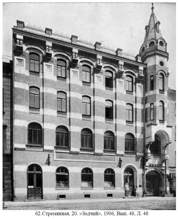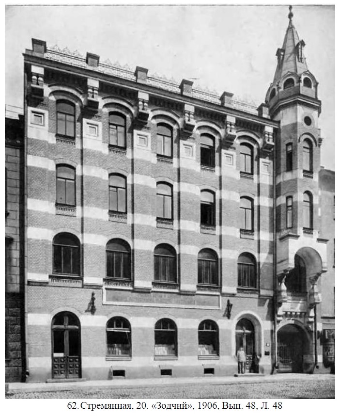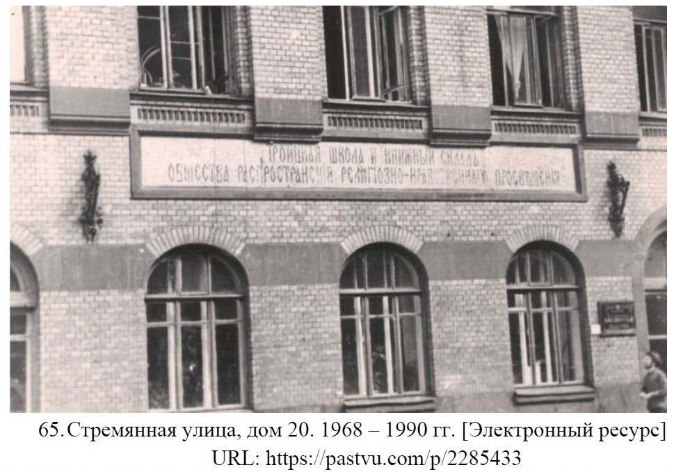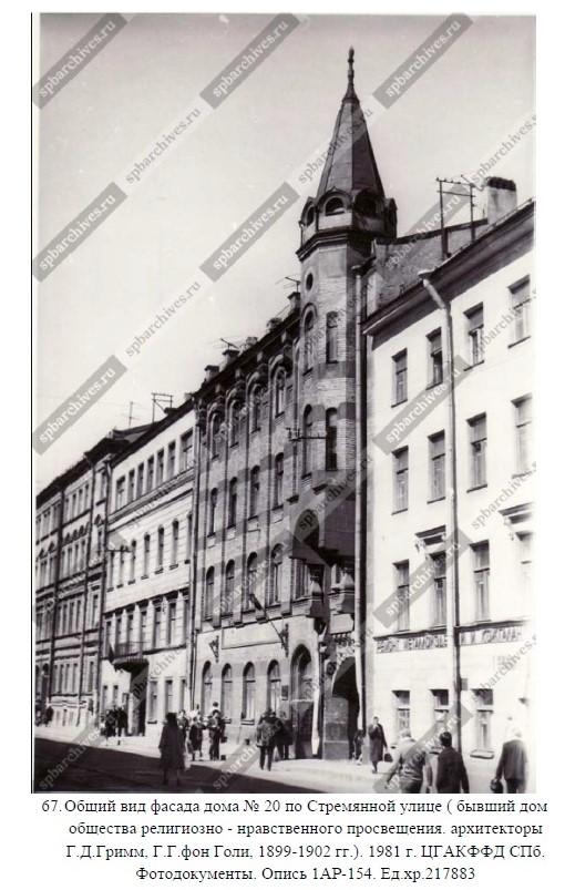 Здание для Общества распространения религиозно-нравственного просвещения на Стремянной улице спроектировал в 1899 году Густав Густавович фон Голи. Позднее проект был переработан архитектором Германом Давидовичем Гриммом.