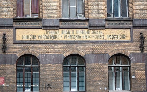 В уровне второго этажа фасад здания украшает мозаичная надпись «Троицкая школа и книжный склад Общества распространения религиозно-нравственного просвещения», выполненная художником-мозаичистом Владимиром Александровичем Фроловым в 1901 году.