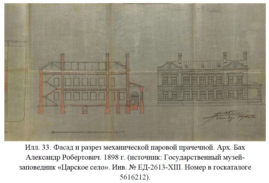 Уже в 1898 году преемником на должности придворного архитектора Царскосельского дворцового правления Александром Робертовичем (Романовичем) Бахом разрабатываются чертежи каменной двухэтажной механической паровой прачечной. Её строительство завершилось к 1904 году.