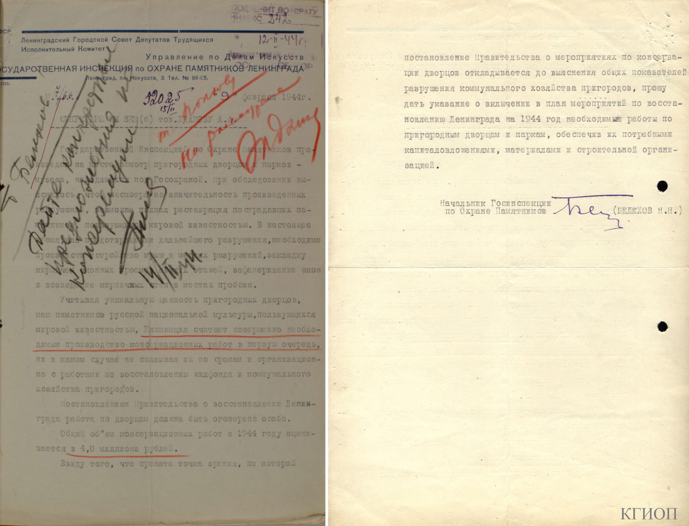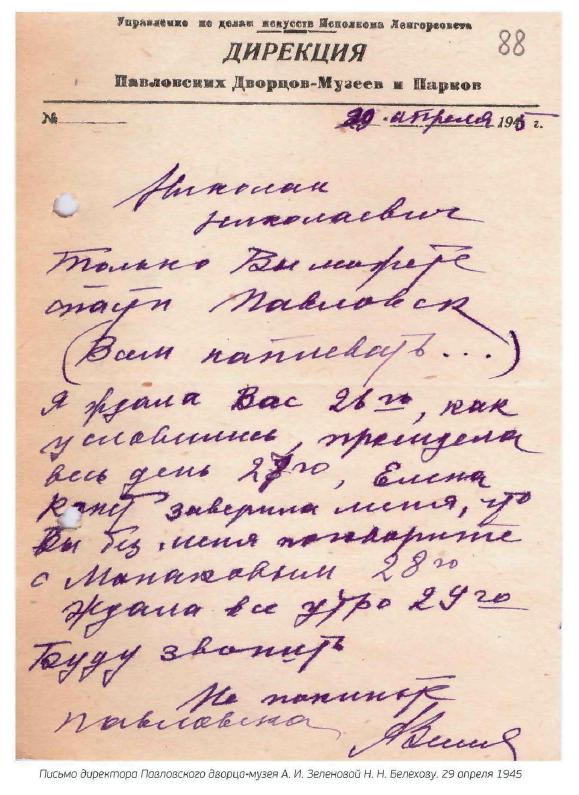 Об этом красноречиво говорит записка директора Павловского дворца-музея Анны Ивановны Зеленовой от 29 апреля 1945 года: «Николай Николаевич, только Вы можете спасти Павловск…».