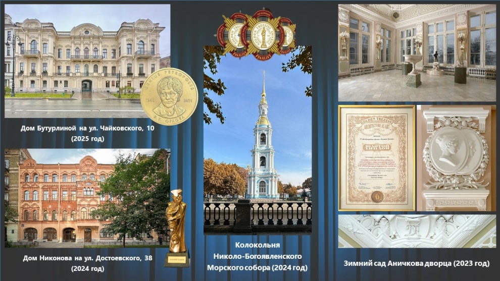 В 2024 году проект реставрации колокольни Николо-Богоявленского Морского собора стал финалистом в номинации «Лучший реализованный проект реставрации», а проект реставрации керамического декора на фасаде доходного дома архитектора Николая Никитича Никонова на улице Достоевского, 38 — победителем в номинации «Лучший реализованный проект фасада или интерьера с использованием керамики».