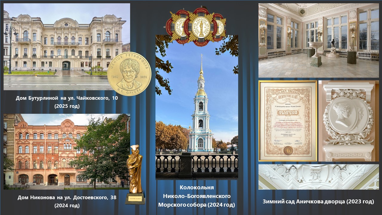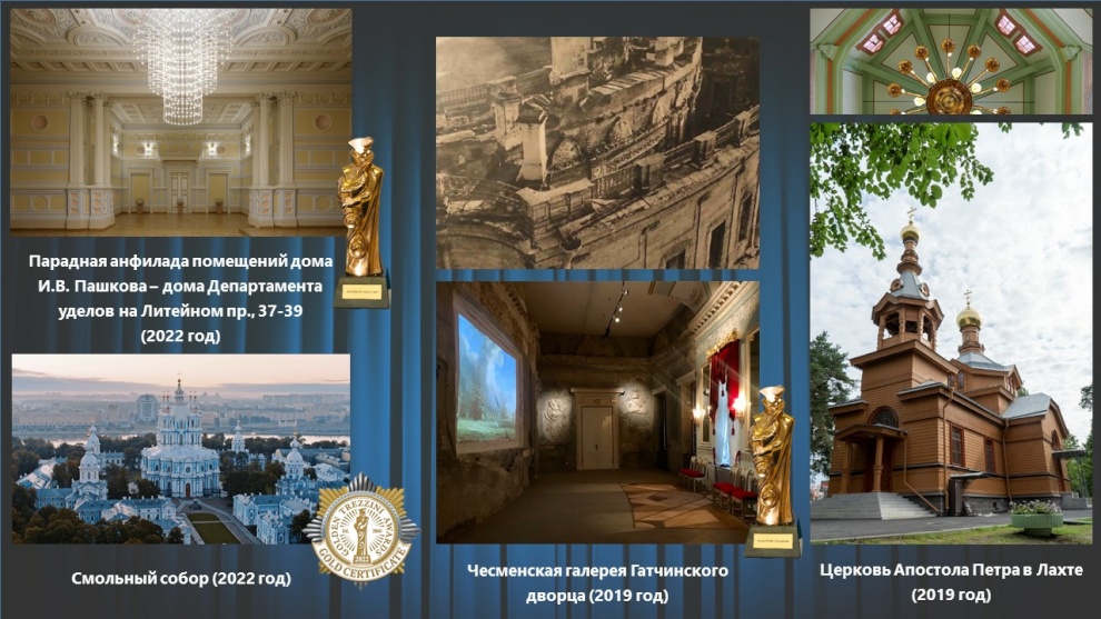 В 2022 году проект реставрации парадной анфилады помещений дома И. В. Пашкова (дома Департамента уделов) на Литейном проспекте, 37–39 победил в номинации «Лучший реализованный проект интерьера общественного пространства», комплексная реставрация Смольного собора отмечена золотым диплом в номинации «Лучший реализованный проект реставрации/реконструкции».