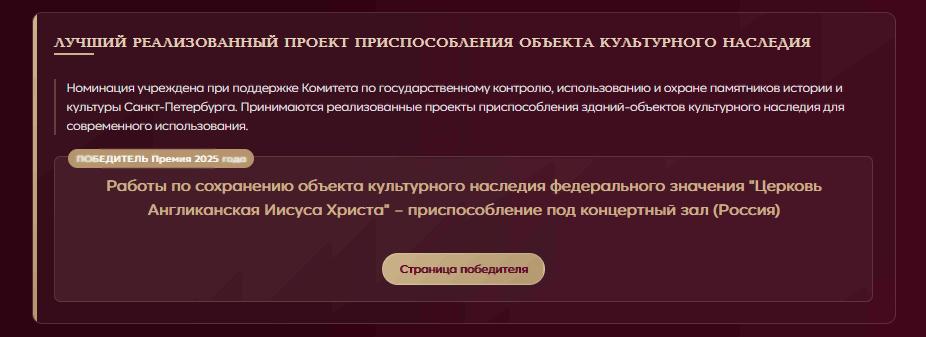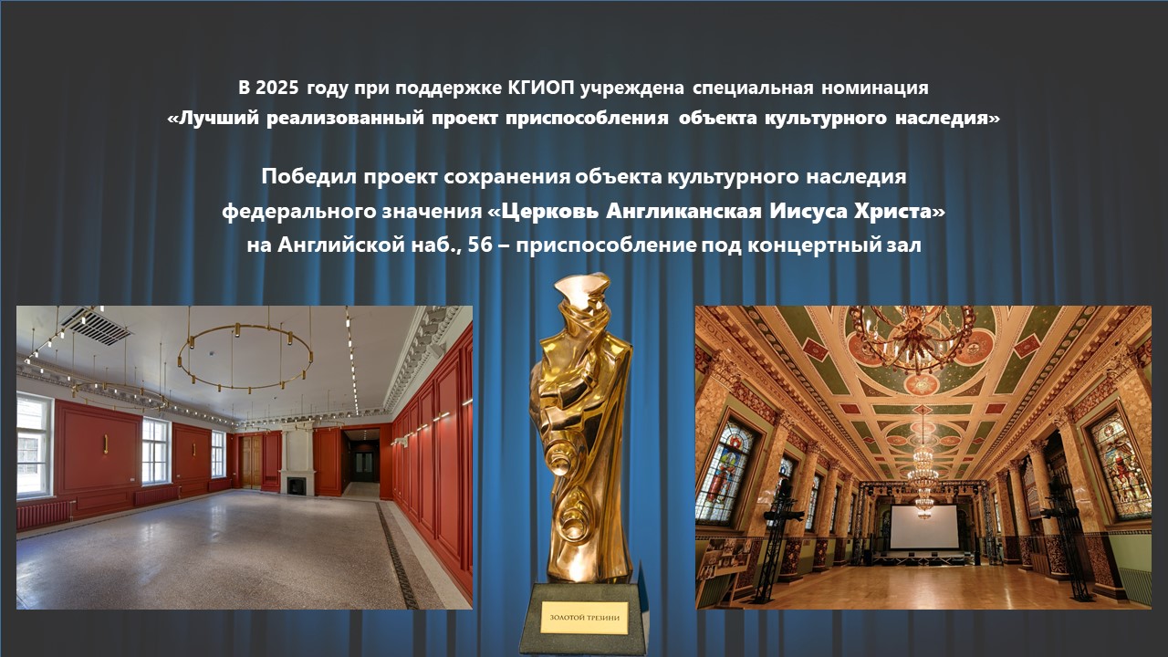 В 2025 году при поддержке КГИОП была учреждена номинация «Лучший реализованный проект приспособления объекта культурного наследия». В прошлом году победу в этой номинации одержал проект сохранения объекта культурного наследия федерального значения «Церковь Англиканская Иисуса Христа» на Английской набережной, 56 — приспособление под концертный зал.
