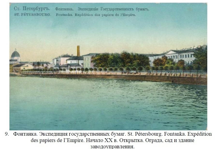 На гравюре Михаила Николаевича Рашевского за 1886 год показаны набережная Фонтанки и расположенные с отступом от красной линии здание заводоуправления 1816–1818 годов с садом и производственный корпус 1857–1861 годов с дымовыми трубами. Ограда занимала участок от служебного (ныне несуществующего) и жилого корпуса в левой части гравюры до также несуществующего сейчас служебного корпуса в правой части гравюры с деревьями на месте построенного в 1905 году здания типографии.