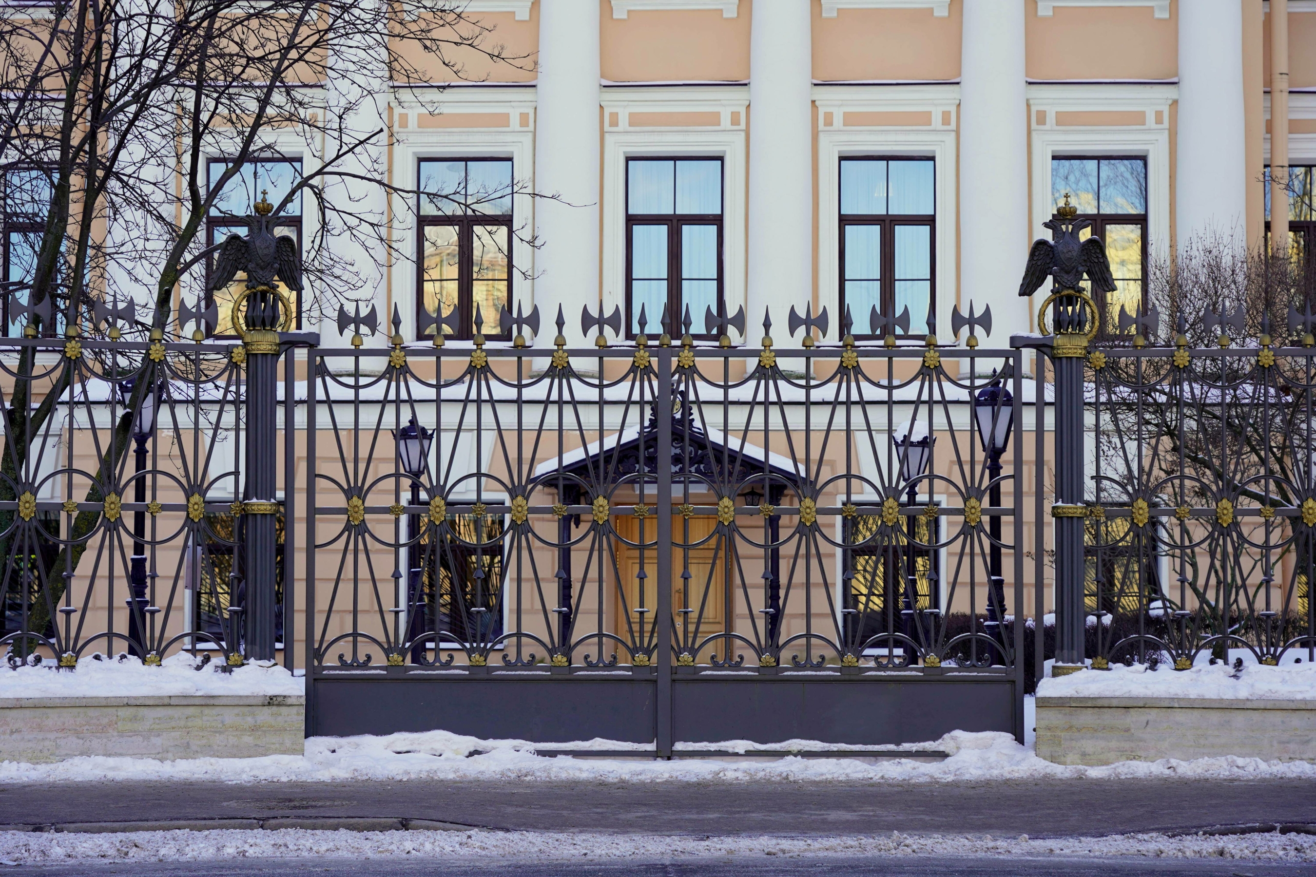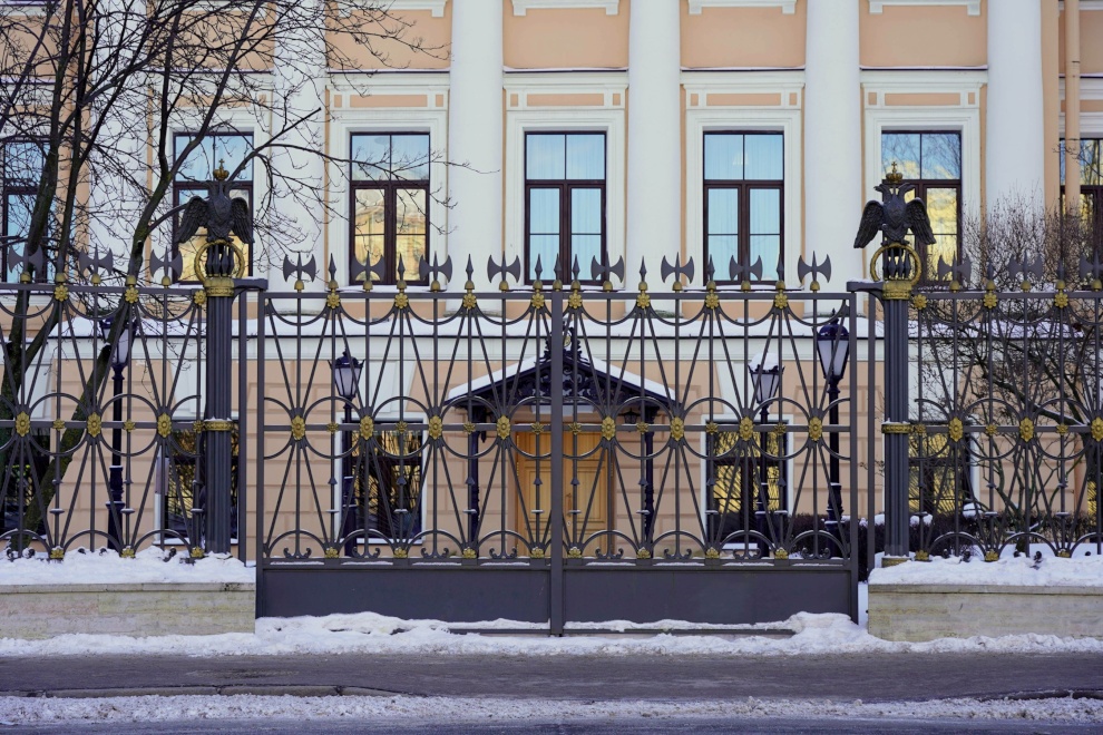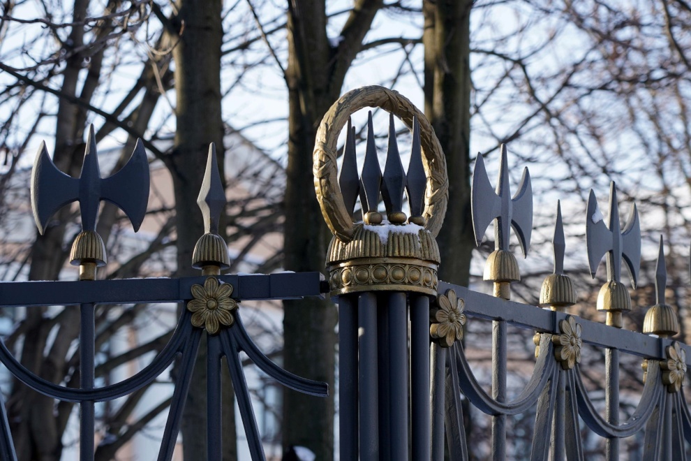 Скульптуры орлов выполнены из чугуна, короны окрашены под бронзу.