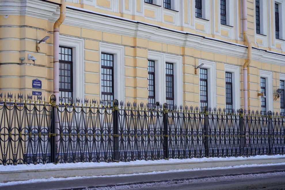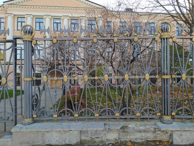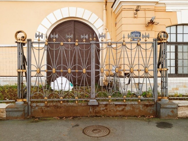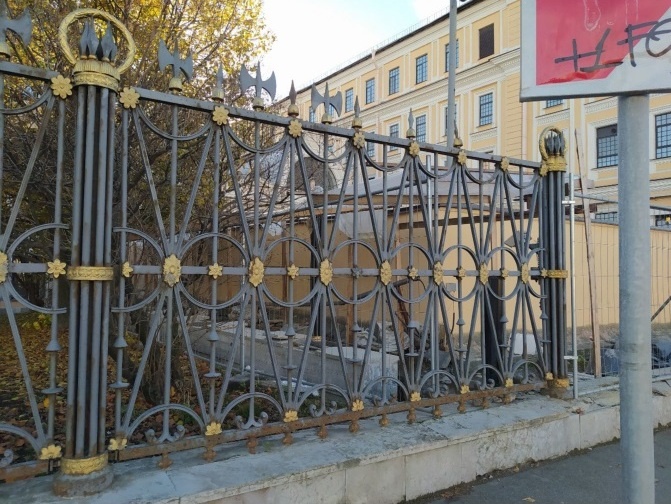 Функциональным и декоративно-художественным элементом композиции фабричного ансамбля в панораме набережной реки Фонтанки является металлическая ограда, выполненная в стиле классицизм.