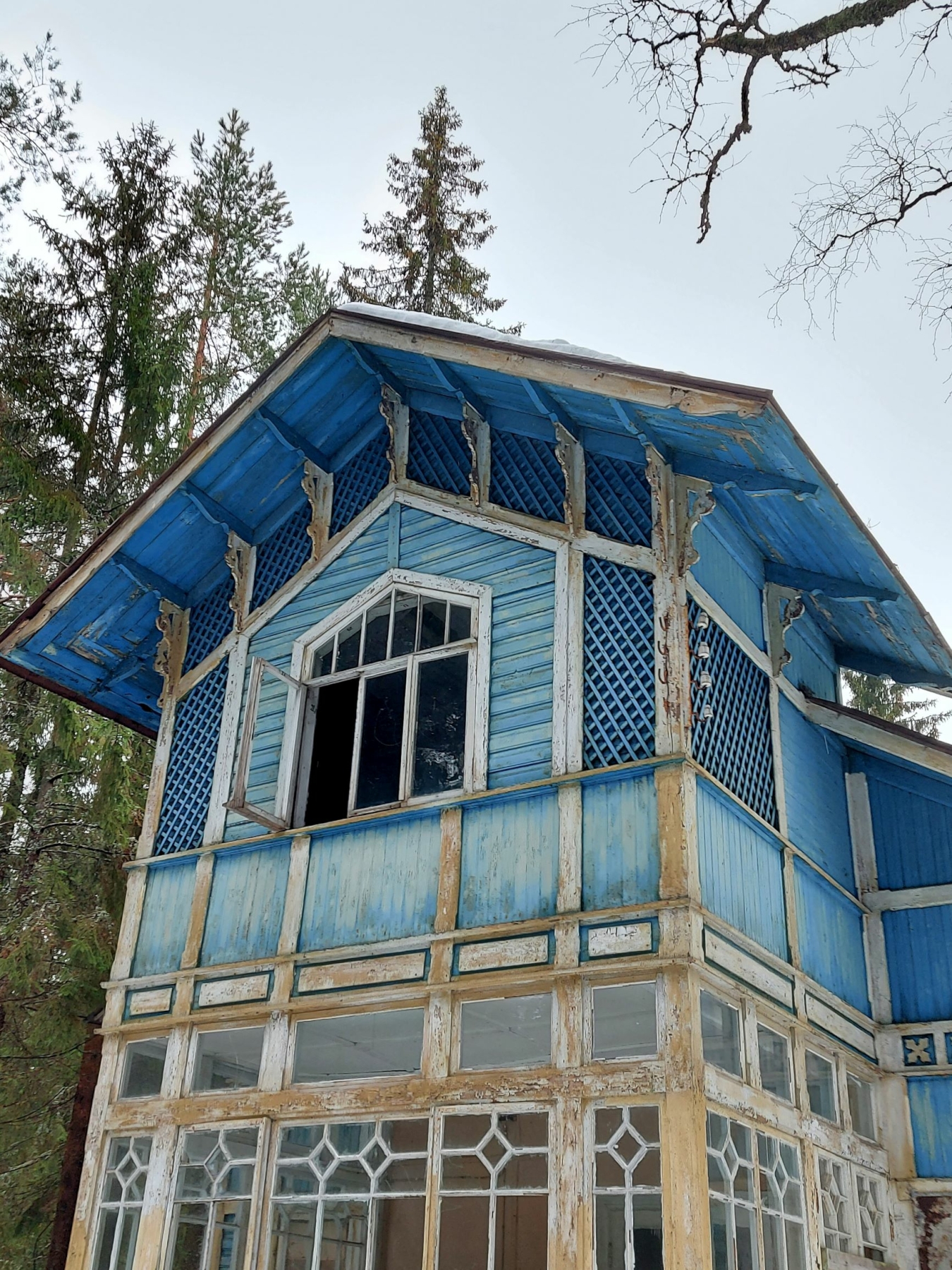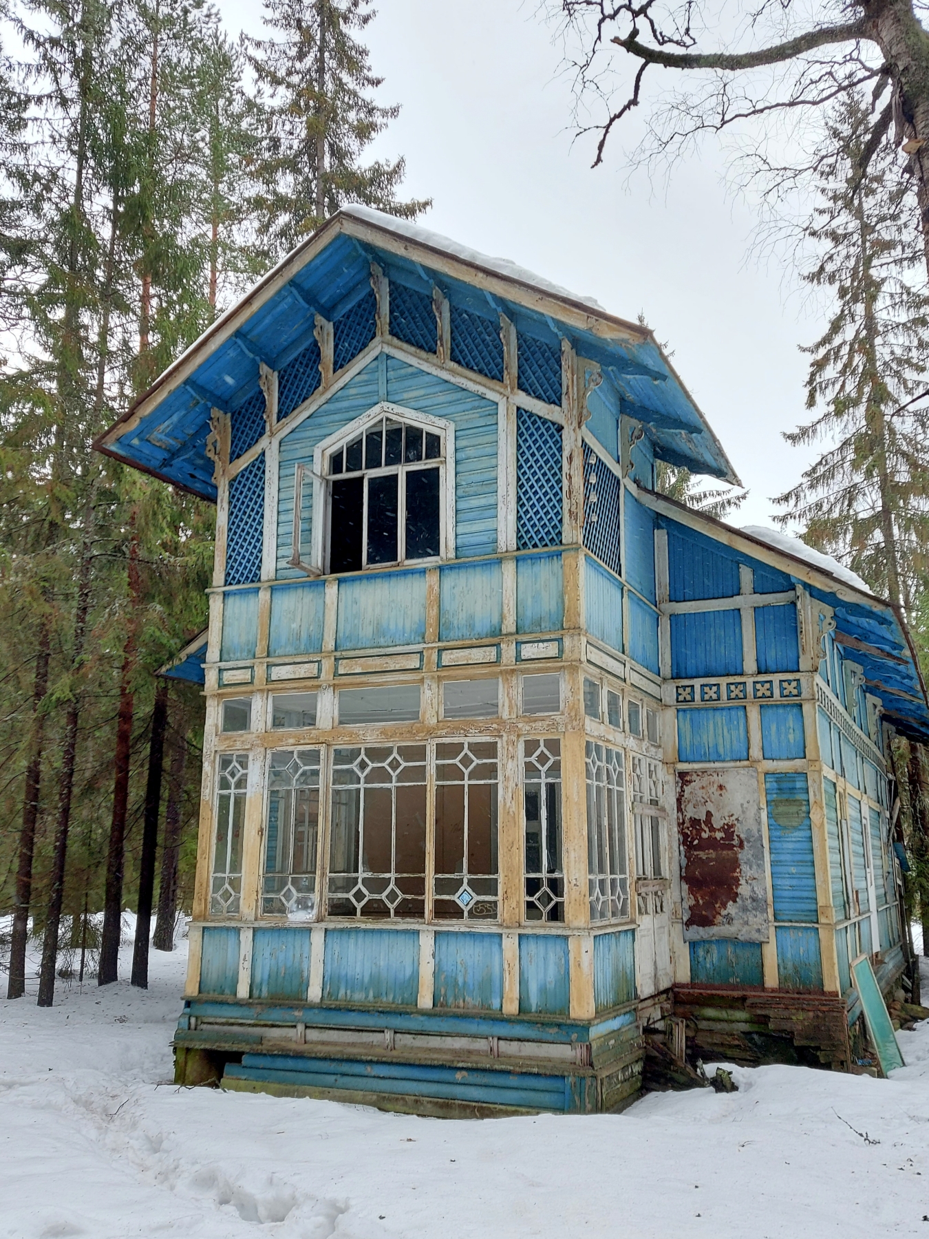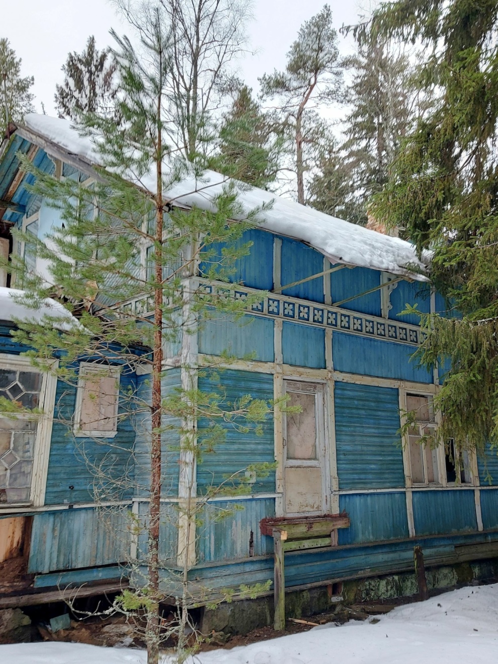 Восточный и западный фасады оформлены декором под фахверк и поясом с квадрифолиями (четырёхлистниками, мотив декоративного обрамления в виде комбинации квадрата и цветка с четырьмя симметричными лепестками). С южной стороны находилась одноэтажная веранда с террасой и главным крыльцом. С террасы открывался живописный вид на Финский залив и дворовую территорию. С южной стороны на участке был ручей, спускающийся к побережью.