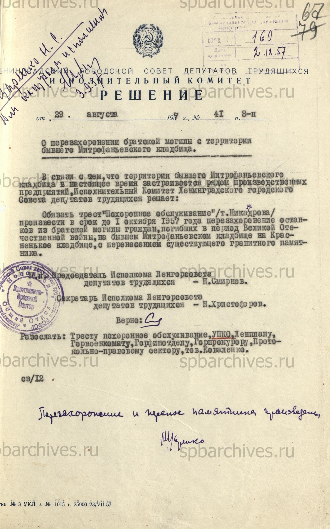 Анализ планов Треста ГРИИ соотносится с решением Исполкома Ленгорсовета «О перезахоронении братской могилы с территории бывшего Митрофаньевского кладбища» от 29 августа 1957 года (ЦГА СПб, Ф.3200, Оп.8, Д.53, Л.67). На экземпляре решения, поступившего из Архивного комитета Санкт‑Петербурга, есть отметка о производстве перезахоронения и переноса памятника.