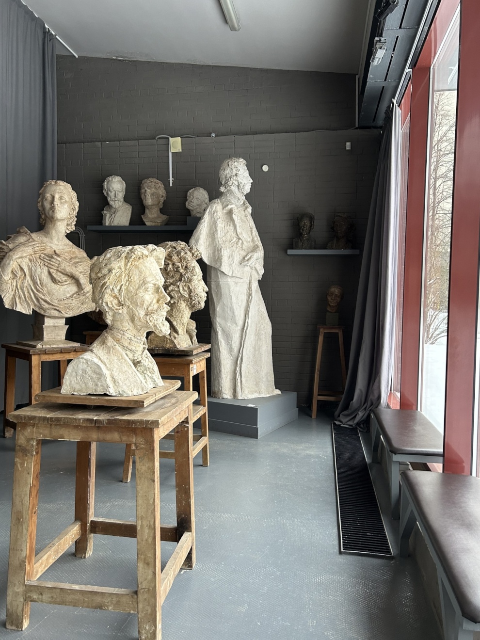 Мастерская оборудована всем необходимым для работы над крупными скульптурами: металлическим станком — основанием для модели, который может перемещаться по уложенным в полу рельсам и вращаться. Сверху закреплён мощный крюк для подъёма тяжёлых скульптур.