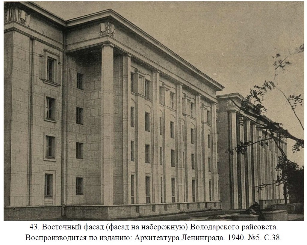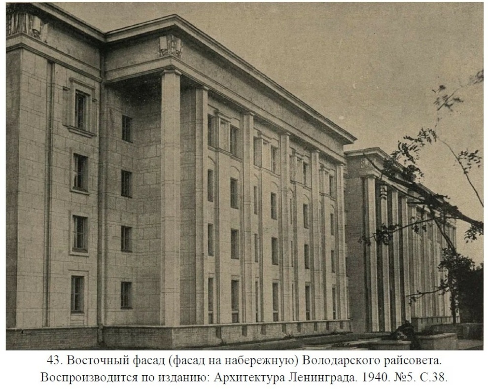 Проект Володарского райсовета был разработан архитекторами Евгением Адольфовичем Левинсоном и Игорем Ивановичем Фоминым совместно с архитектором Георгием Евгеньевичем Гедике в 1937–1938 годах, проектирование интерьеров продолжалось в 1939 году.