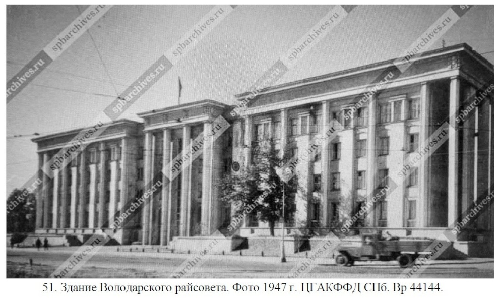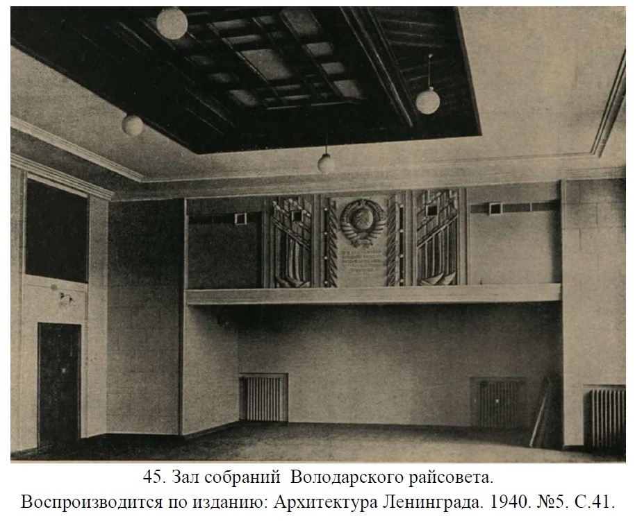 Володарский (с 1948 года — Невский) райсовет начал работать в здании с конца 1940 года. В цокольном этаже находились служебные помещения, в которых размещались инженерно-технические службы, столовая (под залом собраний), и архив райсовета. Второй, третий и четвёртый этажи были заняты кабинетами служащих.