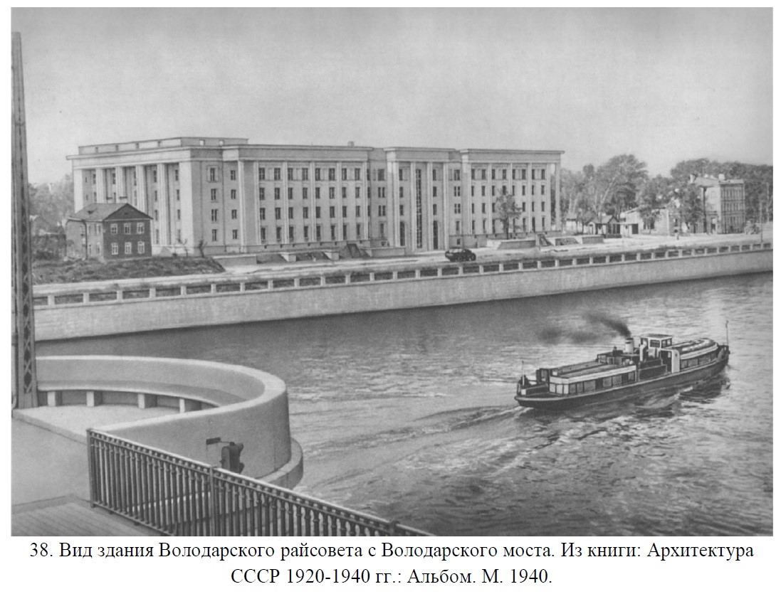 В 1936 году после постройки Володарского моста Ивановскую улицу продлили до железной дороги. По проекту застройки в новой части улицы предусматривалось возведение жилого комплекса из восьми домов — по четыре на каждой стороне. Архитекторами Игорем Ивановичем Фоминым, Евгением Адольфовичем Левинсоном, Сергеем Ивановичем Евдокимовым и Софьей Сергеевной Пясковской был задуман монументальный ансамбль около Володарского моста, включавший создание площади к северу от моста и сквера. Важнейшим элементом этого нового архитектурного ансамбля должно было стать здание райсовета.