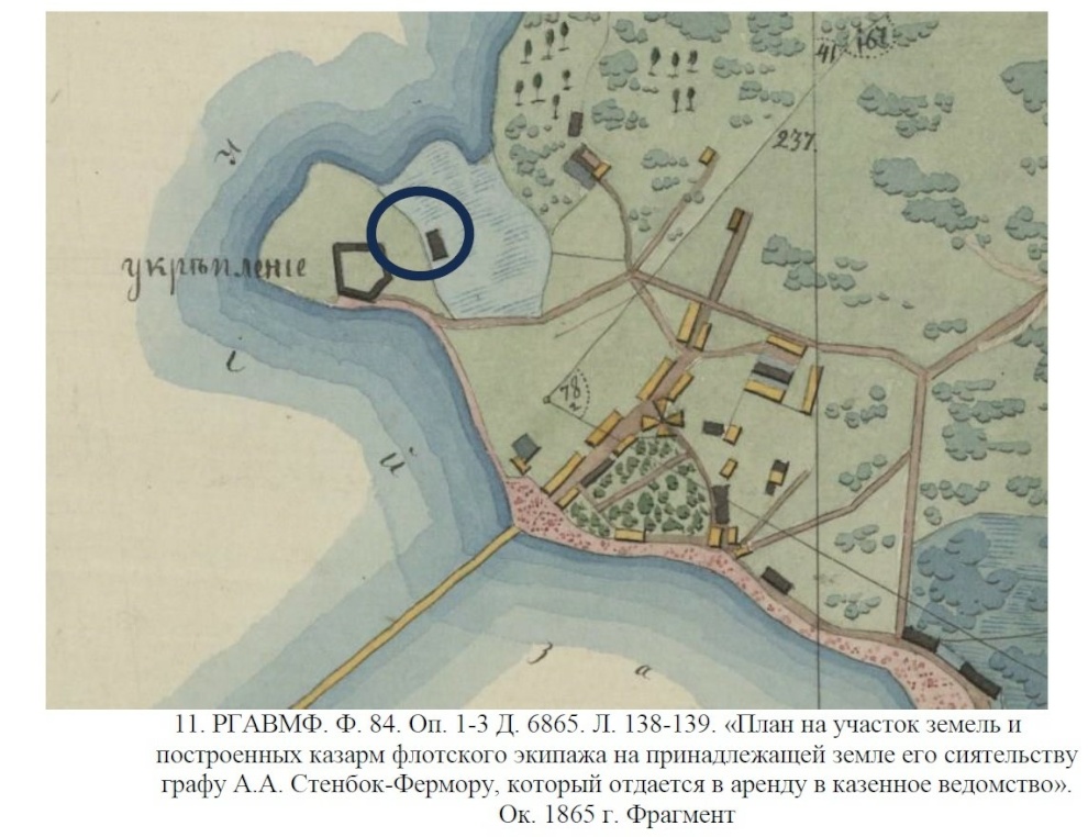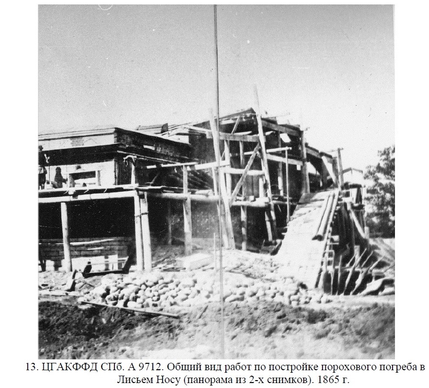 В 1863 году командование Кронштадтского порта приказало построить у гавани Лисьего Носа крупный погреб, рассчитанный на 13,5 пудов пороха. Для строительства было выбрано место ближе к оконечности мыса, в стороне от военного посёлка. Новое здание должно было частично занять место разобранного редута. Для удобства нового строительства Управление Кронштадтского порта приняло решение выкупить у графа Стенбок-Фермора арендованный ранее участок мыса.