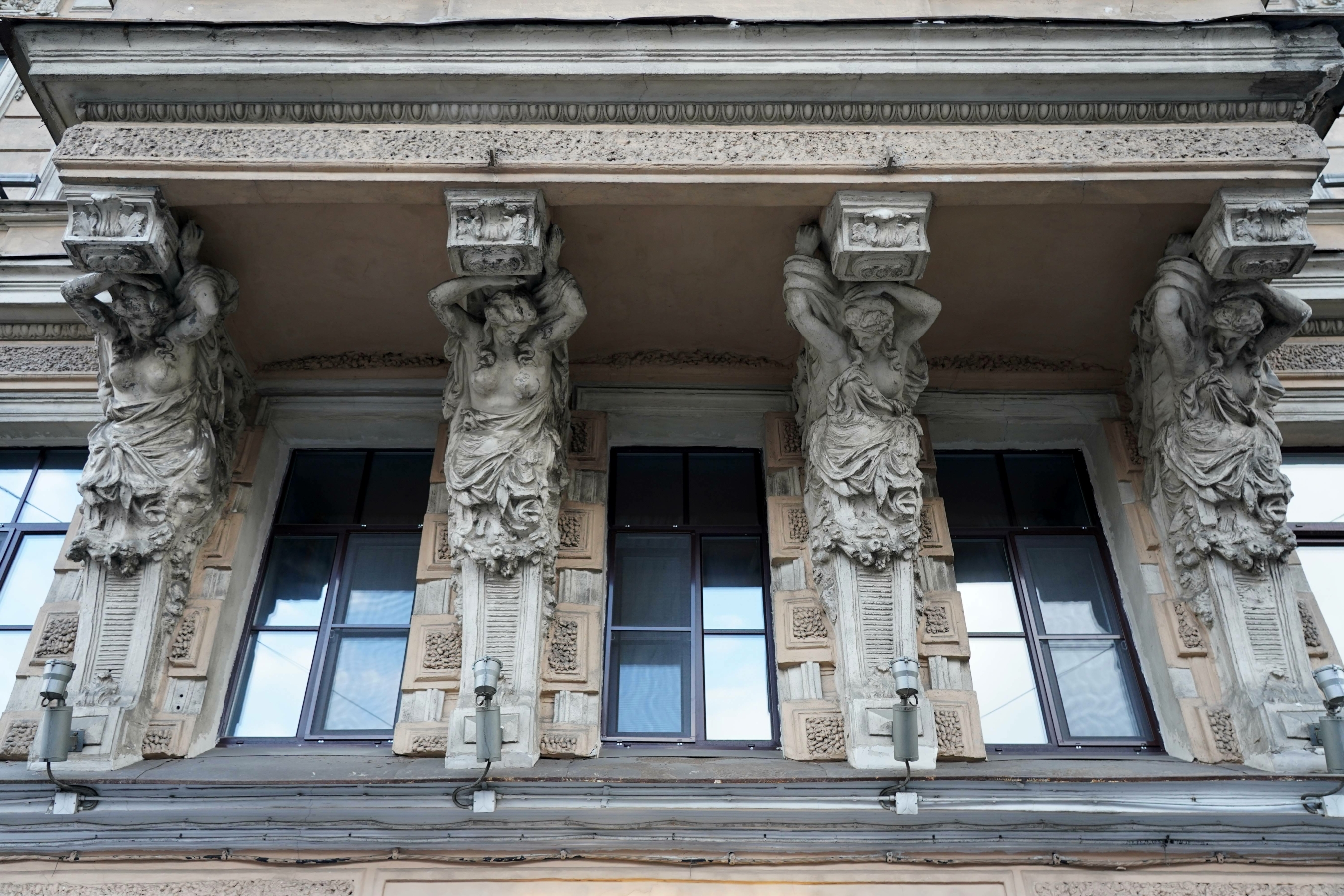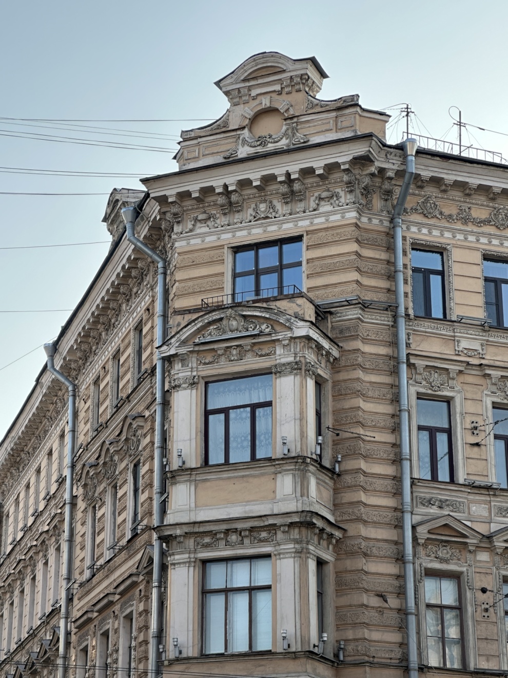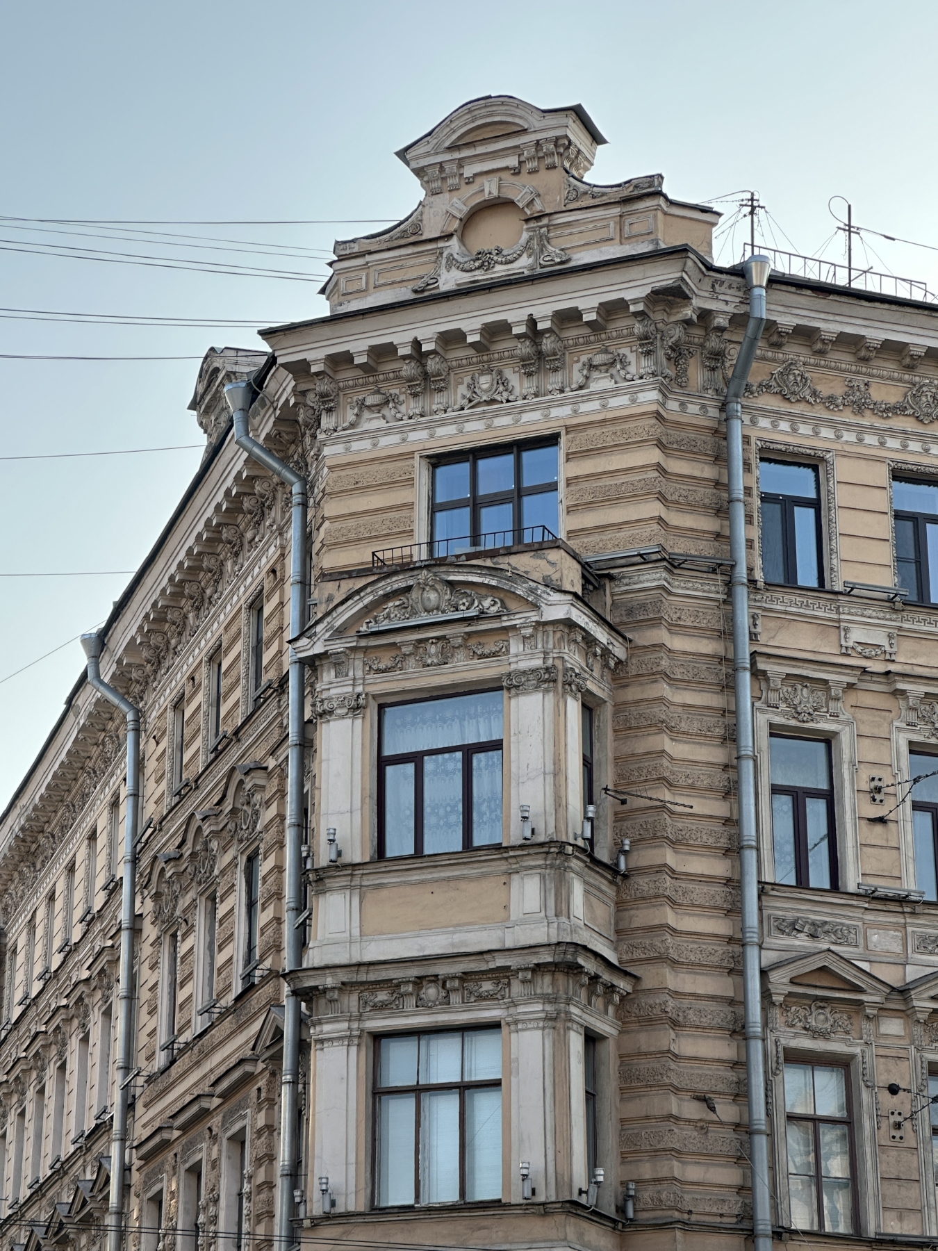 Настенные и угловые эркеры помещены в уровне третьего-четвёртого этажей. Они служат в качестве акцентных объемно-пластических элементов композиции. Фасады обработаны рустом.