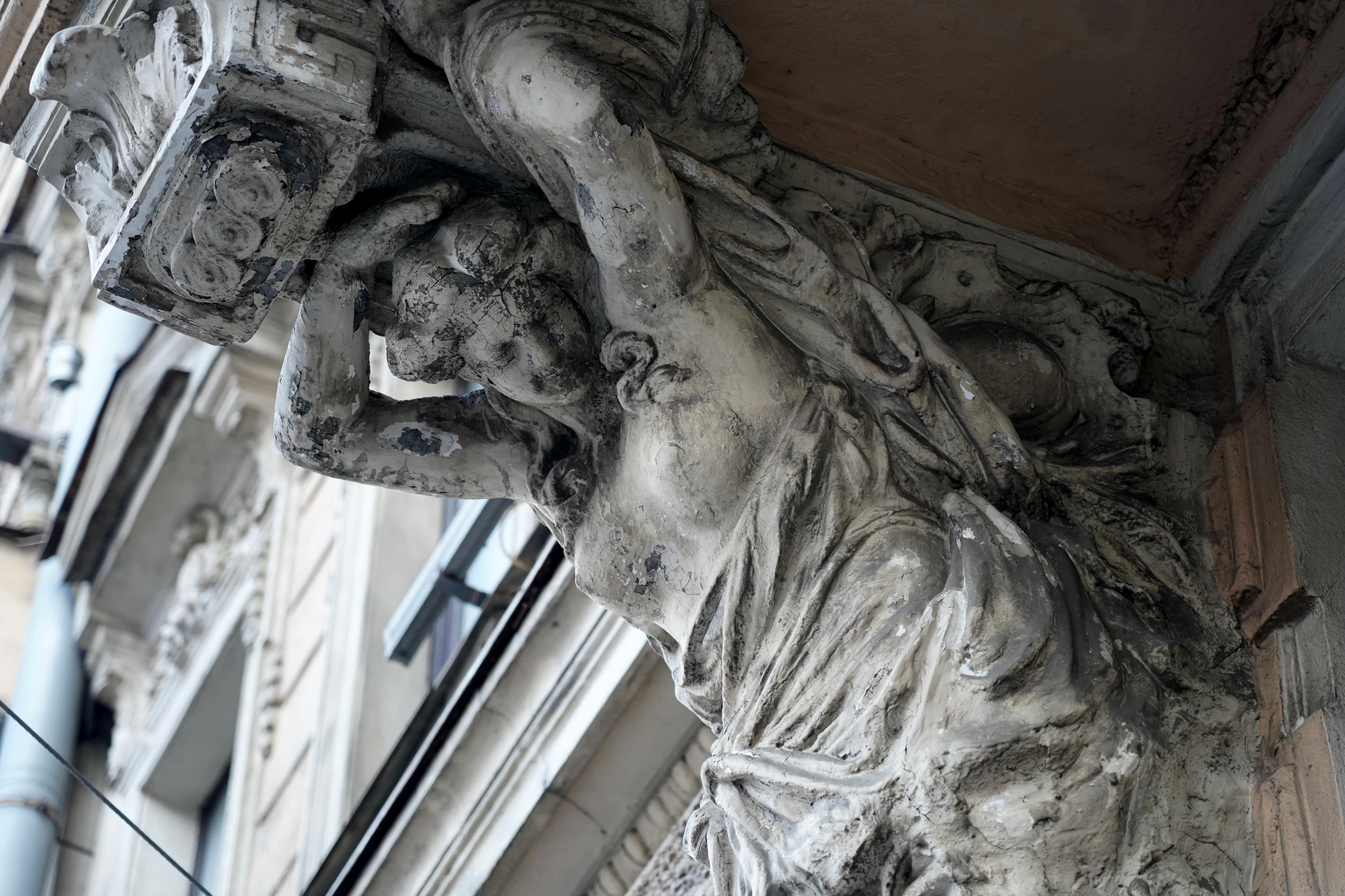 Наблюдаются крупные и мелкие утраты элементов архитектурного и лепного декора, нарушение его пластики, сквозные трещины, коррозия металлических элементов крепления. Геометрия профилированного декора искажена в результате выполненных ранее ремонтных работ, рисунок тянутых элементов декора нарушен вследствие многослойных окрасок и обмазок.