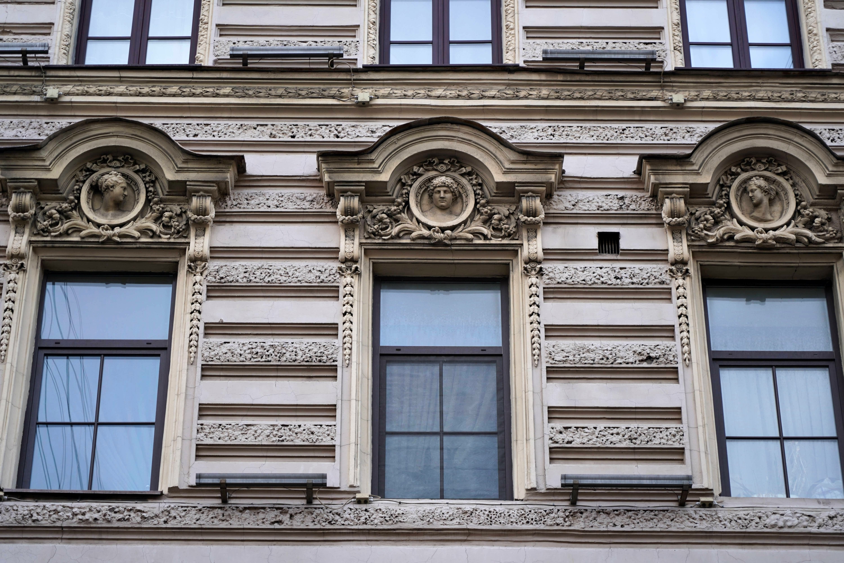 В целом, состояние фасадов здания, расположенного по адресу Невский пр., 79/ Пушкинская ул., 2, аналогично состоянию фасада здания по адресу Невский проспект, 77/ Пушкинская улица, 1. Штукатурная отделка фасадов имеет многочисленные дефекты в виде трещин, деструкций, загрязнений, крупных утрат с оголением и разрушением кирпичной кладки. Двери не соответствуют историческим, окна различаются по цвету и расстекловке.