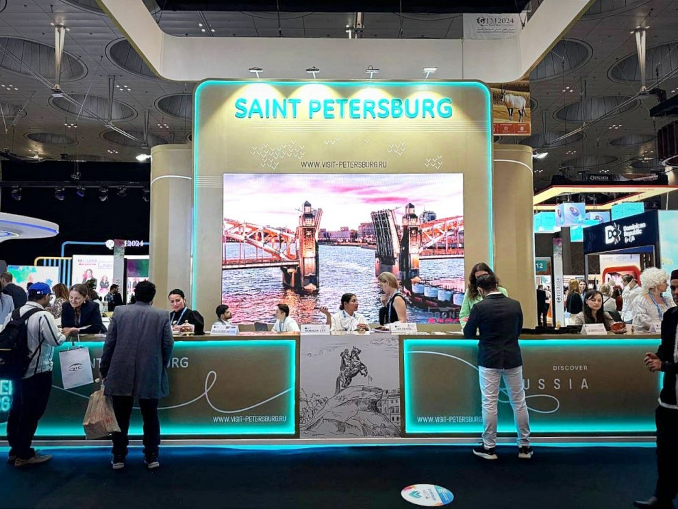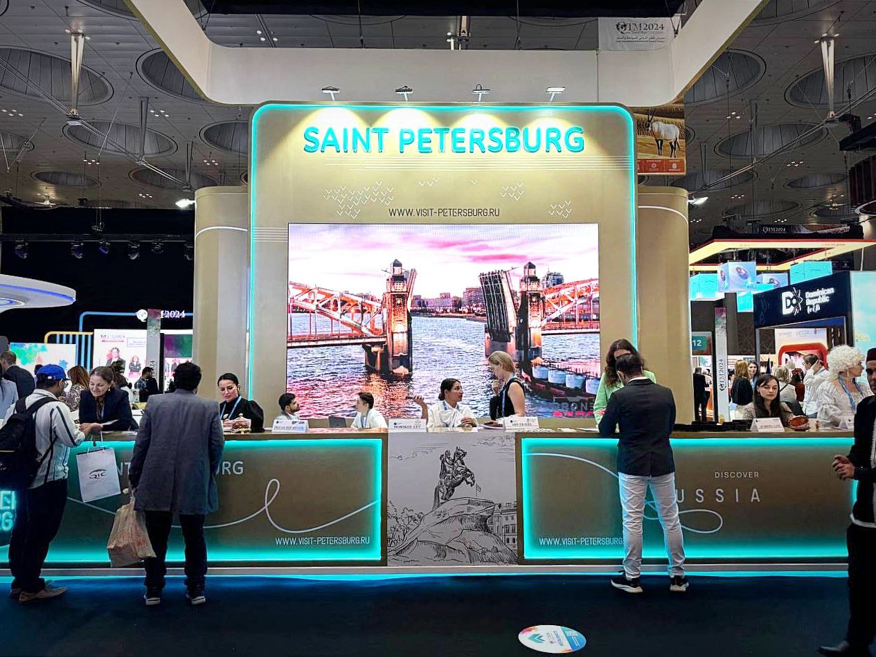 Тематическую экспозицию нашего города, выполненную в песочно-золотой гамме, организовало Конгрессно-выставочное бюро. Здесь проходят презентации петербургских туристских предложений, в том числе созданных специально для путешественников из стран Ближнего Востока.