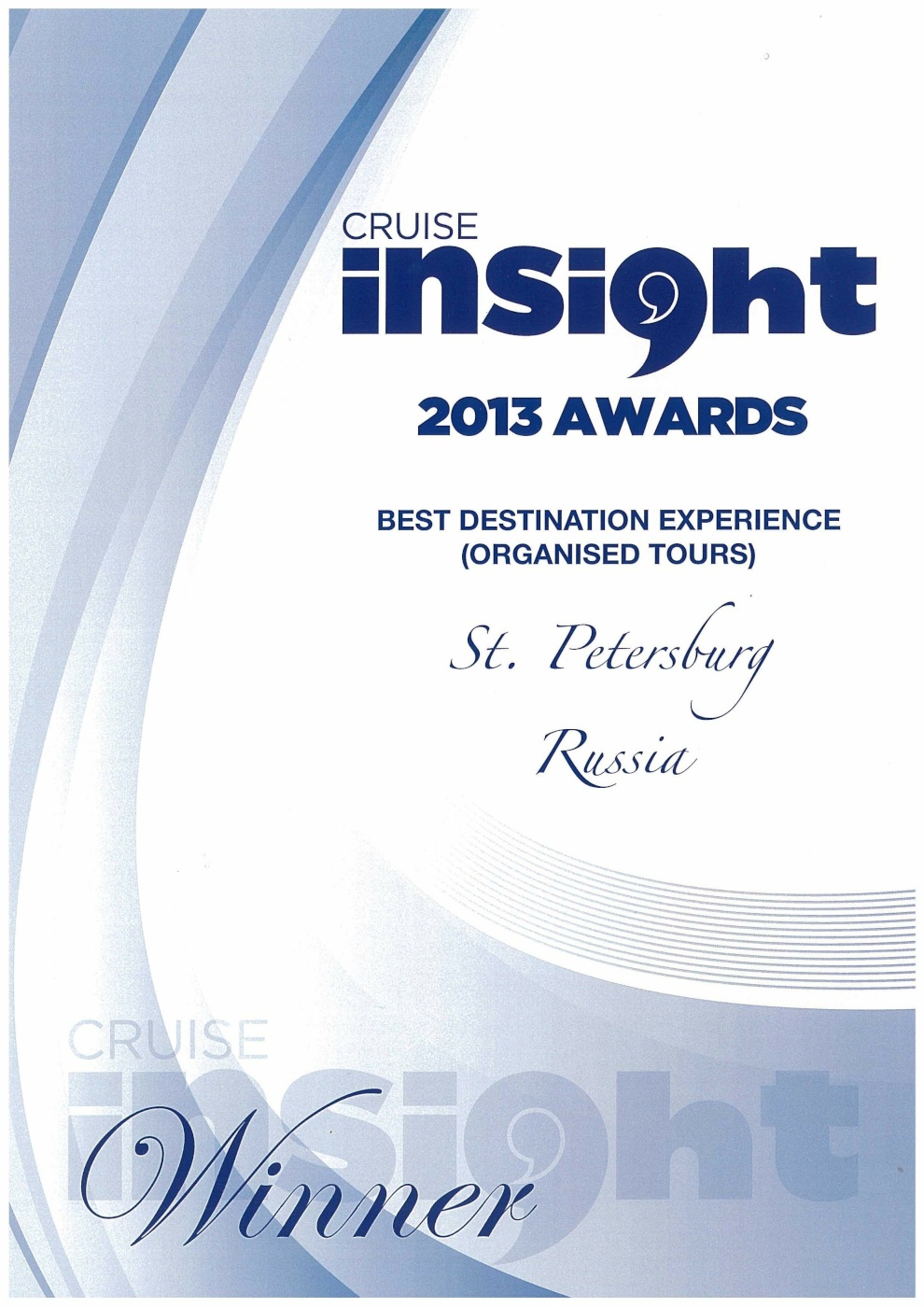 Санкт‑Петербург стал победителем конкурса «2013 Ports & Destinations Awards» и был признан одной из лучших круизных дестинаций, предлагающих качественные туристские программы для организованных туристических групп.