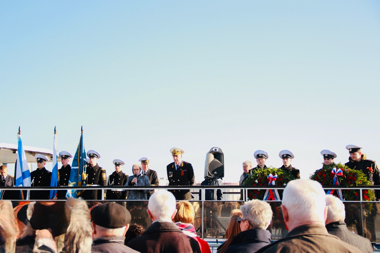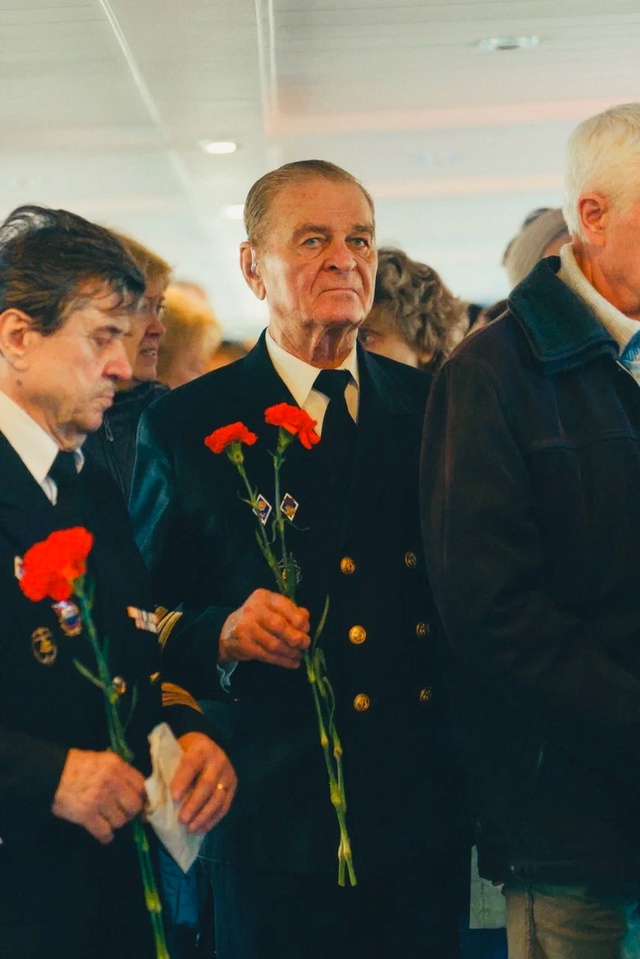 От имени ветеранов с речью выступил Орлов Константин Владимирович, капитан дальнего плавания, в прошлом – председатель профкома Северо-Западного речного пароходства: «Моя жизнь, как и жизни многих, неразрывно связана с морем, а море в годы войны было важнейшей ареной борьбы с нацизмом. Я помню рассказы своих старших товарищей о том, как моряки, рискуя жизнями под обстрелами и бомбежками, доставляли продовольствие, боеприпасы и эвакуировали население. Это сыграло свою героическую роль в обеспечении блокадного Ленинграда и фронта. Многие из них отдали свои жизни в этой борьбе».