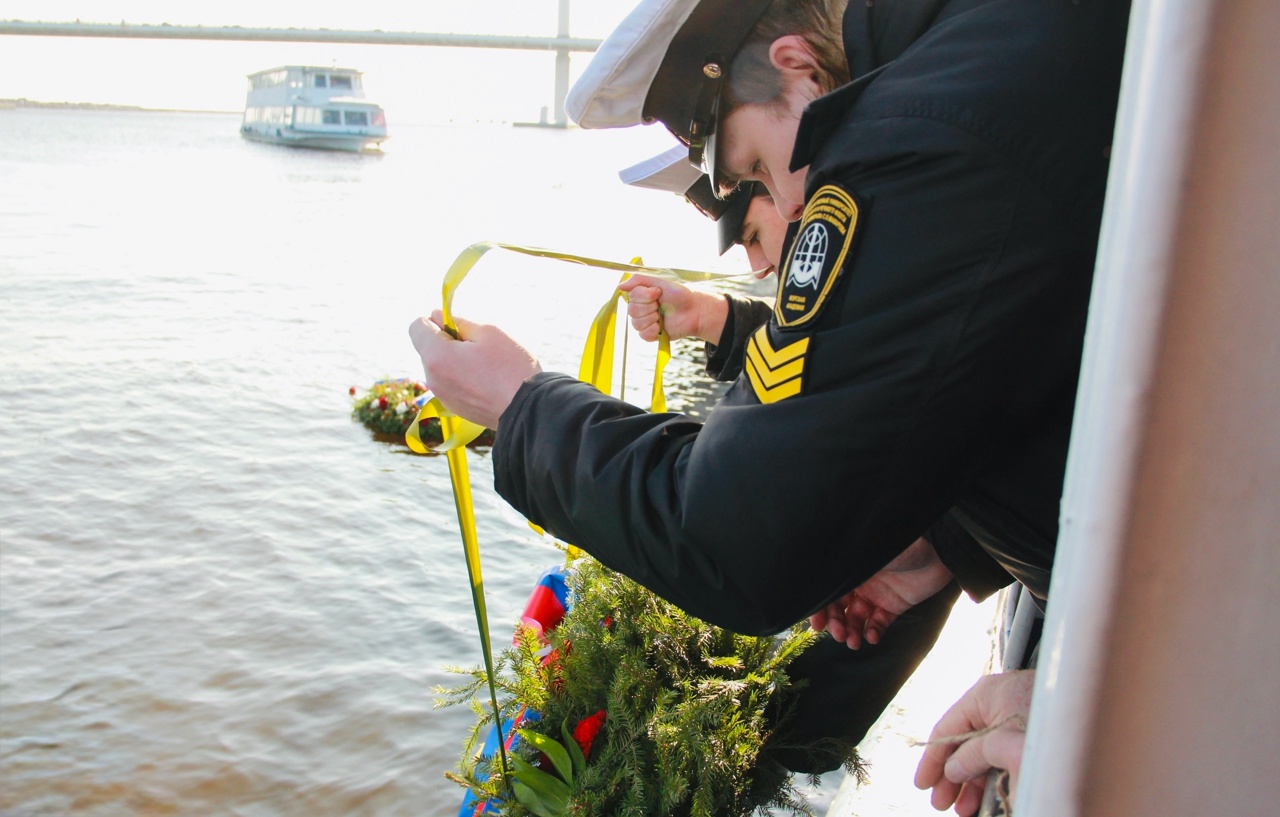 В завершении мероприятия «Рейс памяти» на городском причале состоялась торжественная церемония спуска венков на воду как дань глубокого уважения подвигу тех, кто сражался за свободу и независимость нашей Родины.