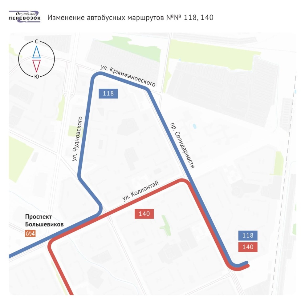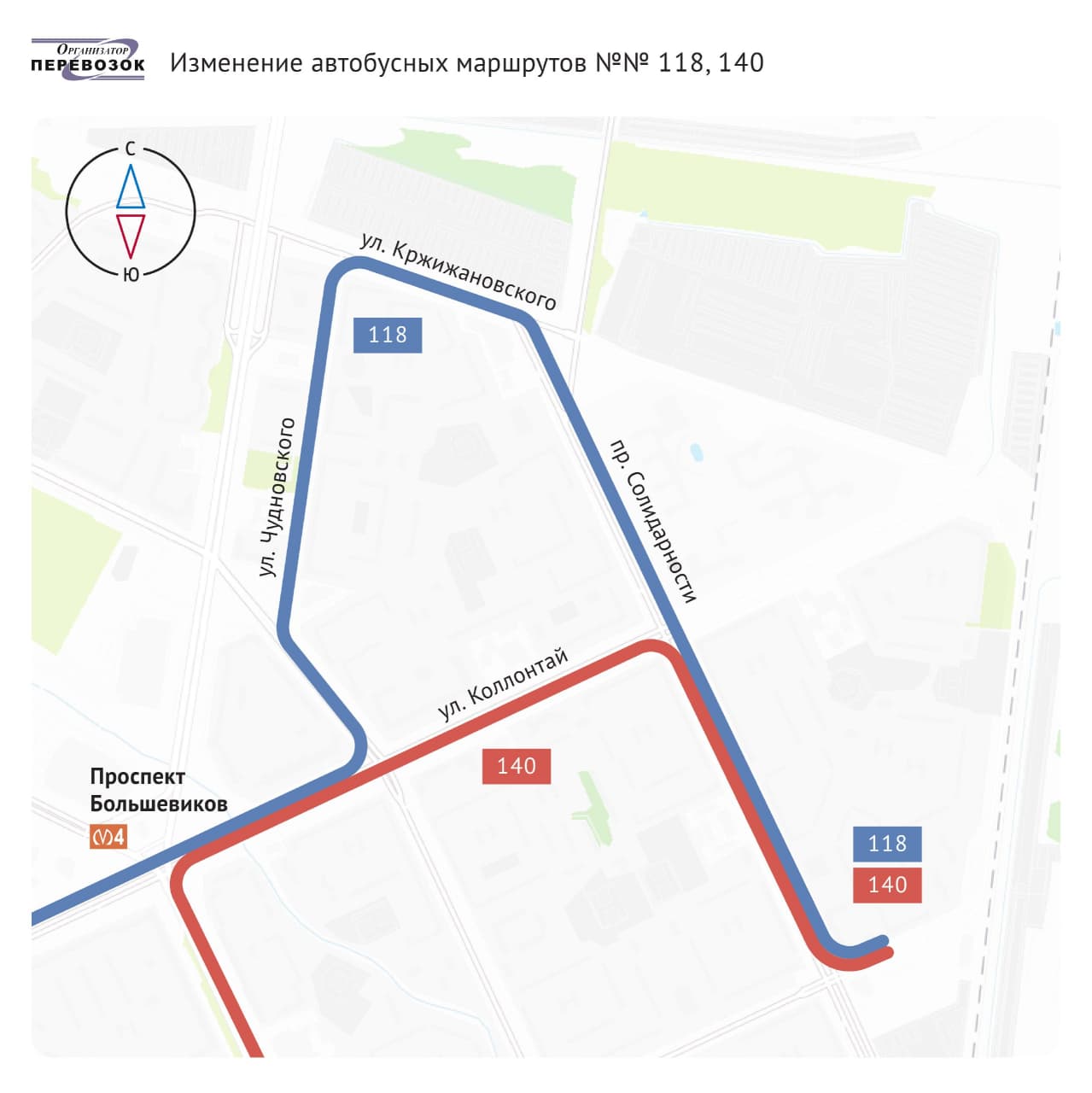 – автобус № 118: от конечной остановки “Проспект Александровской Фермы” по действующей трассе до пр. Солидарности, далее по пр. Солидарности до конечной остановки “Улица Подвойского”;