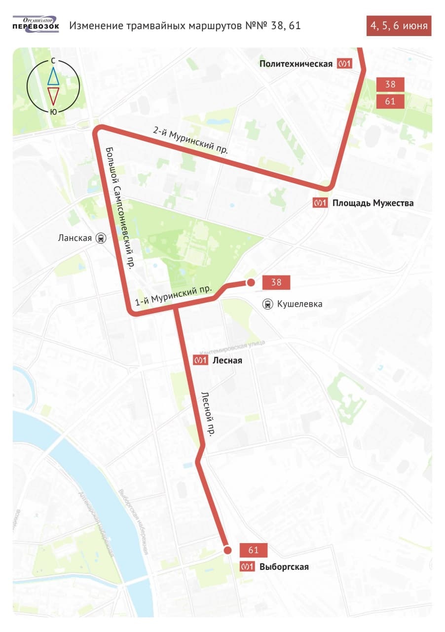 – трамвай № 38: от конечной остановки “Проспект Мечникова” по действующей трассе до пл. Мужества, далее по 2-му Муринскому пр., пр. Энгельса, Б. Сампсониевскому пр.,