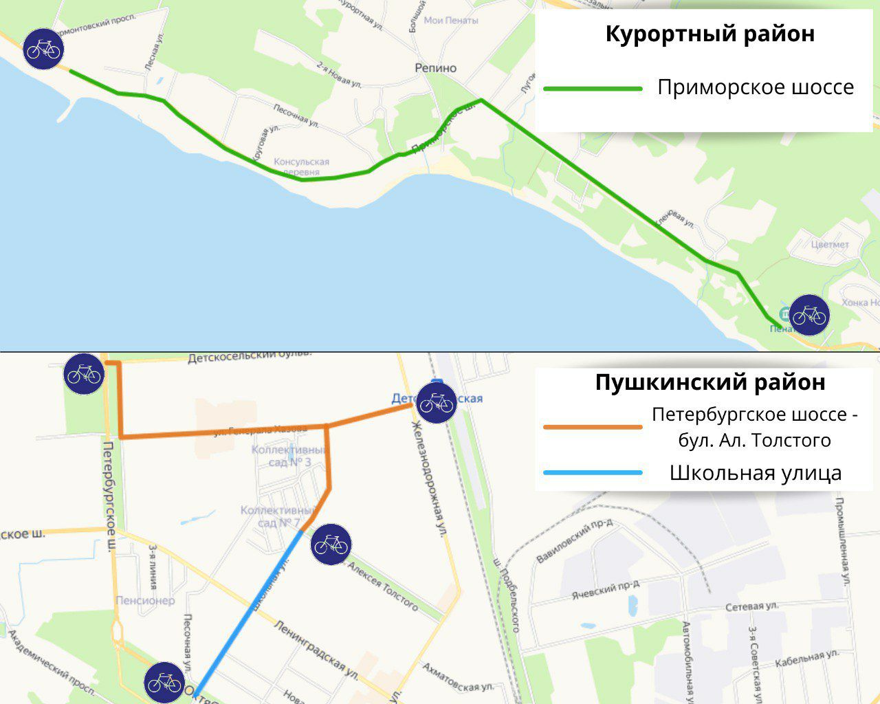 Заключены контракты на проведение проектно-изыскательских работ для размещения трех велосипедных маршрутов в Курортном и Пушкинском районах Санкт‑Петербурга. Заказчиком работ выступает подведомственное Комитету по транспорту СПб ГКУ «Городской центр управления парковками Санкт‑Петербурга».